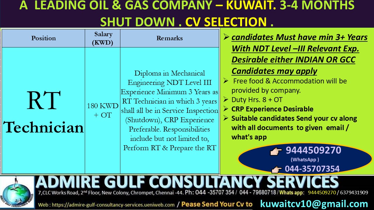 S.No Position Req Salary (KWD) Remarks 1 RT – Technician 4 180 KWD + OT Diploma in Mechanical Engineering NDT Level III Experience Minimum 5 Years as RT Technician in…