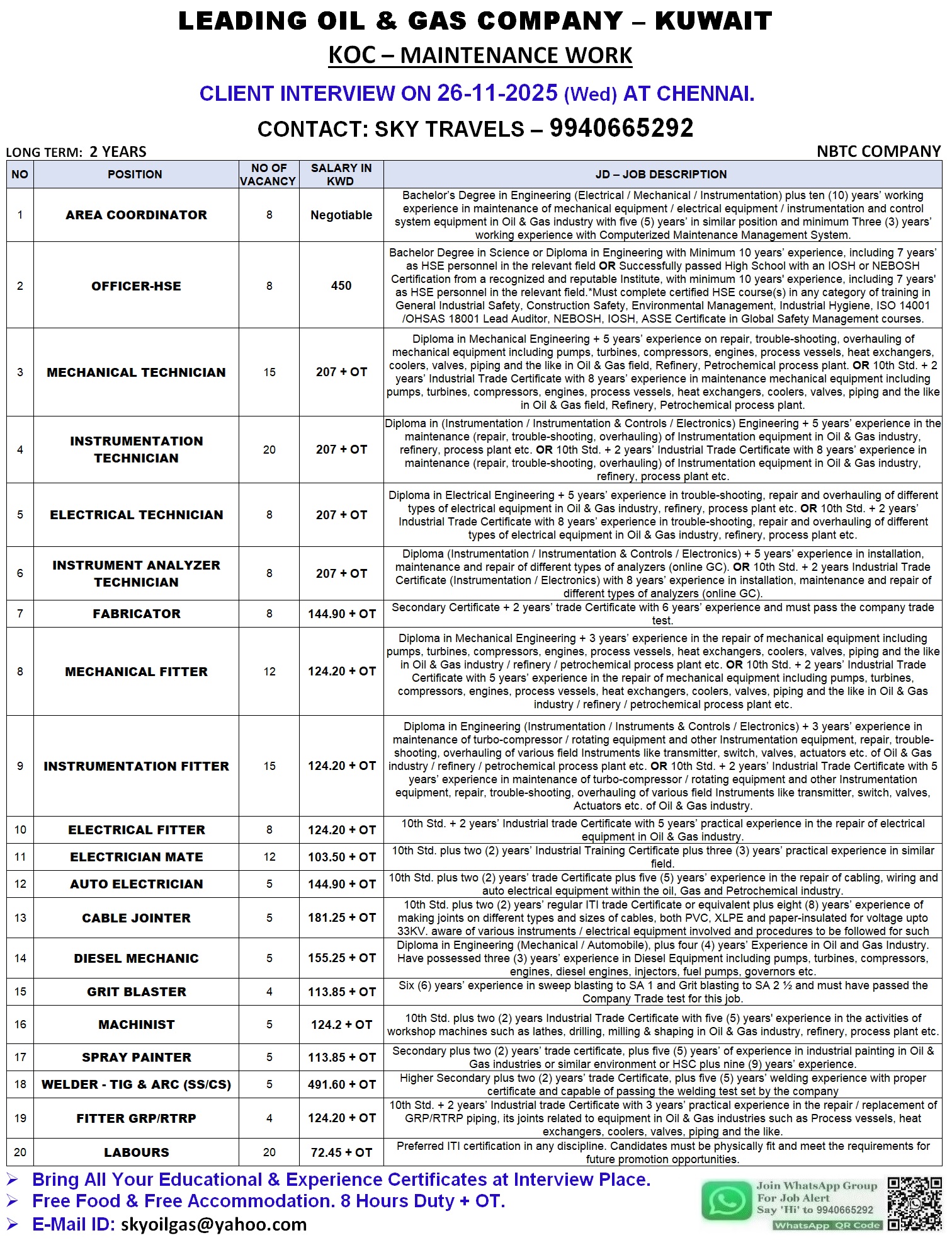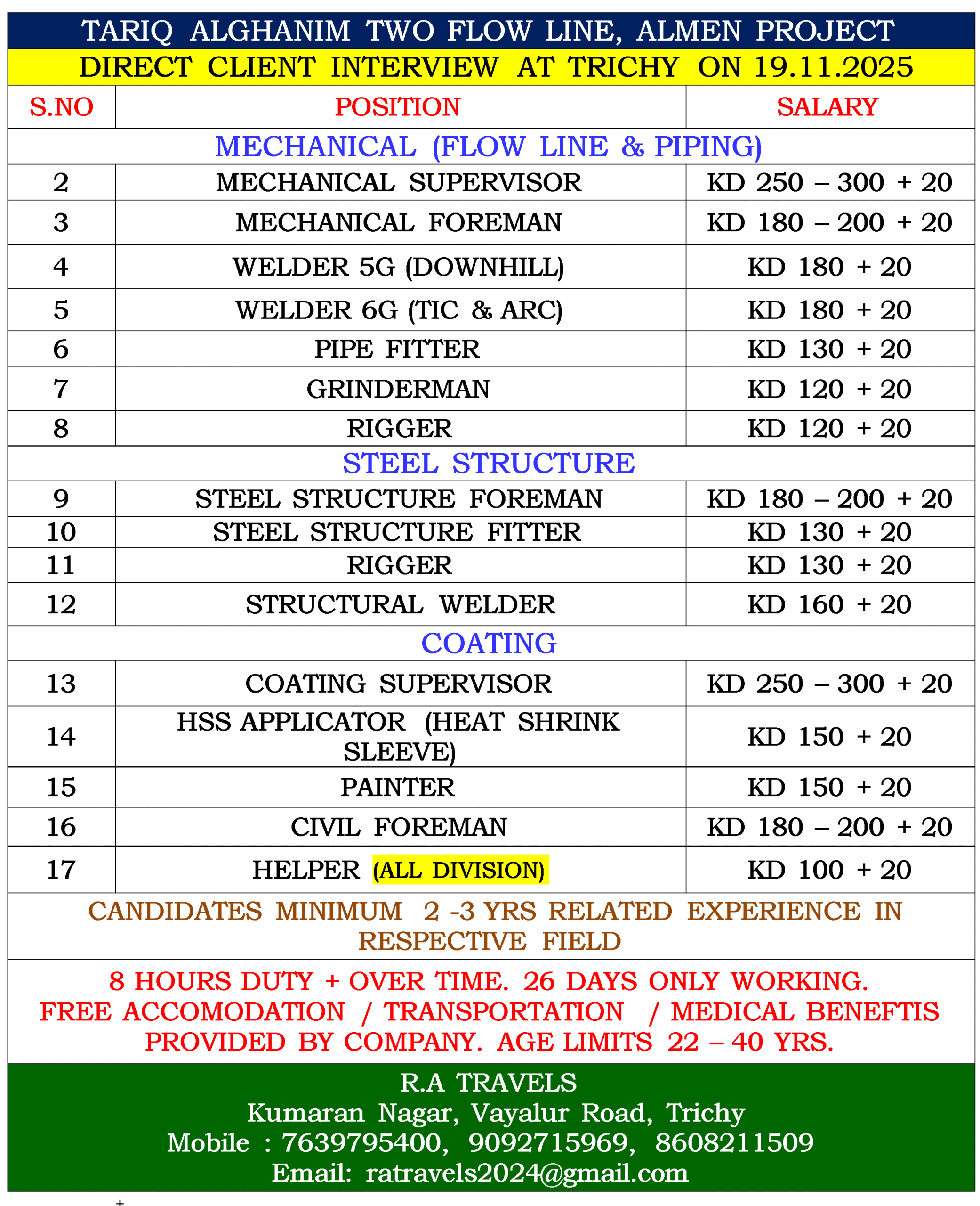 TARIQ ALGHANIM TWO FLOW LINE, ALMEN PROJECT DIRECT CLIENT INTERVIEW AT TRICHY ON 19.11.2025 S.NO POSITION SALARY MECHANICAL (FLOW LINE & PIPING) 2 MECHANICAL SUPERVISOR KD 250 – 300 +…