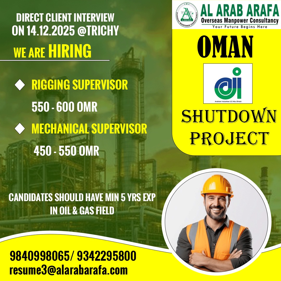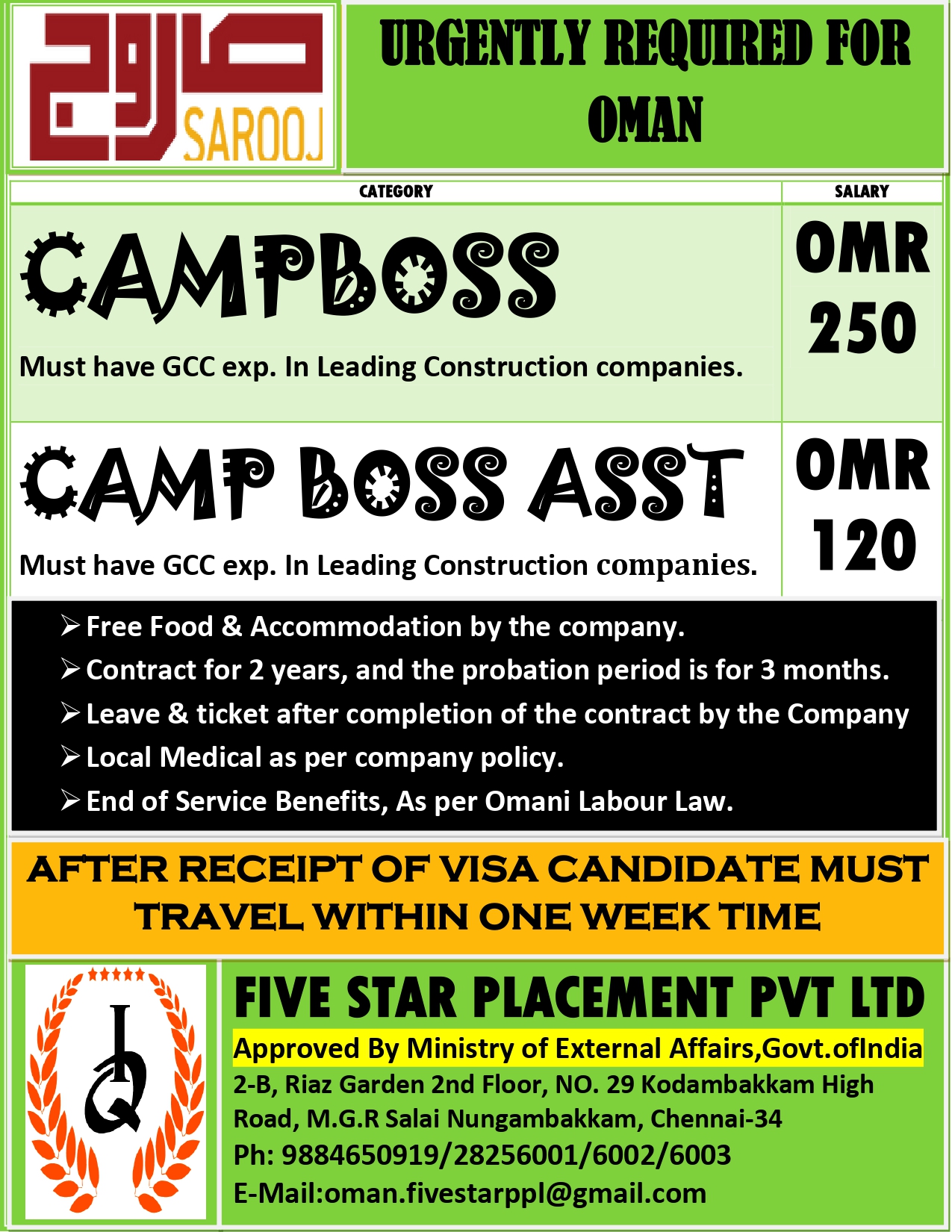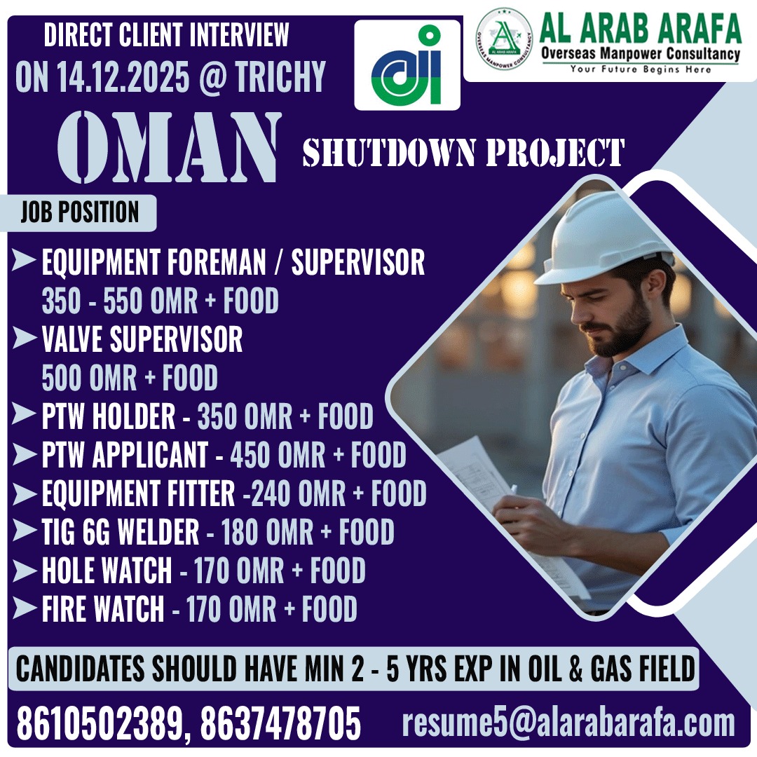 URGENT REQUIREMENT FOR OMAN Interested candidates can share your cv along with all credentials below Mail Id EMAIL:[email protected] CONTACT NO : 9884650919/044-28256001/28256002/28256003