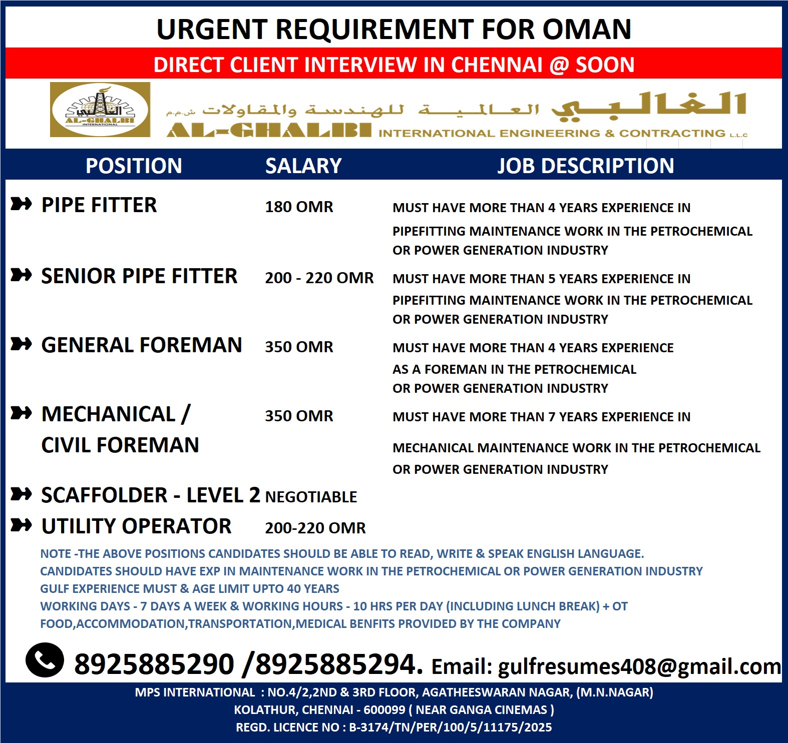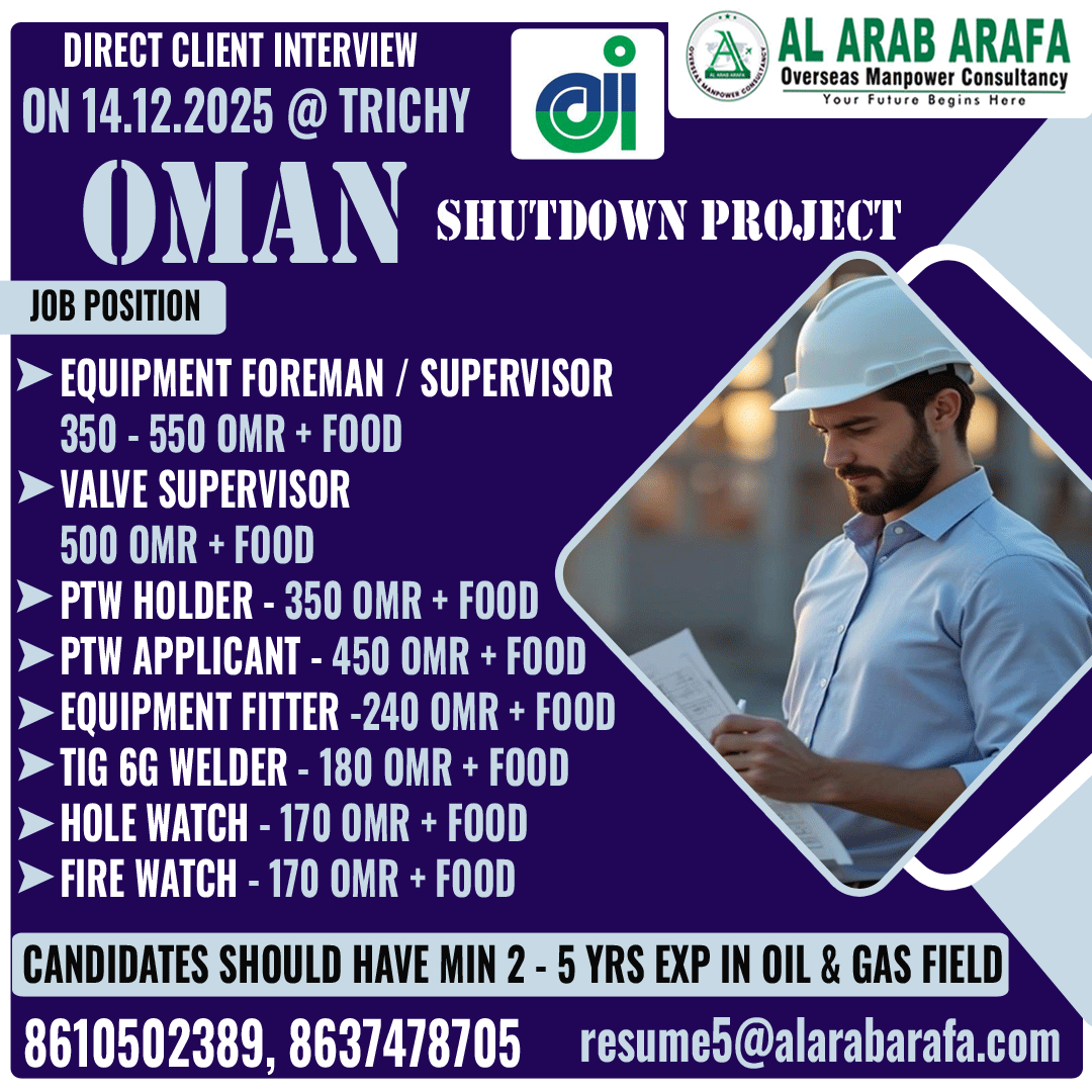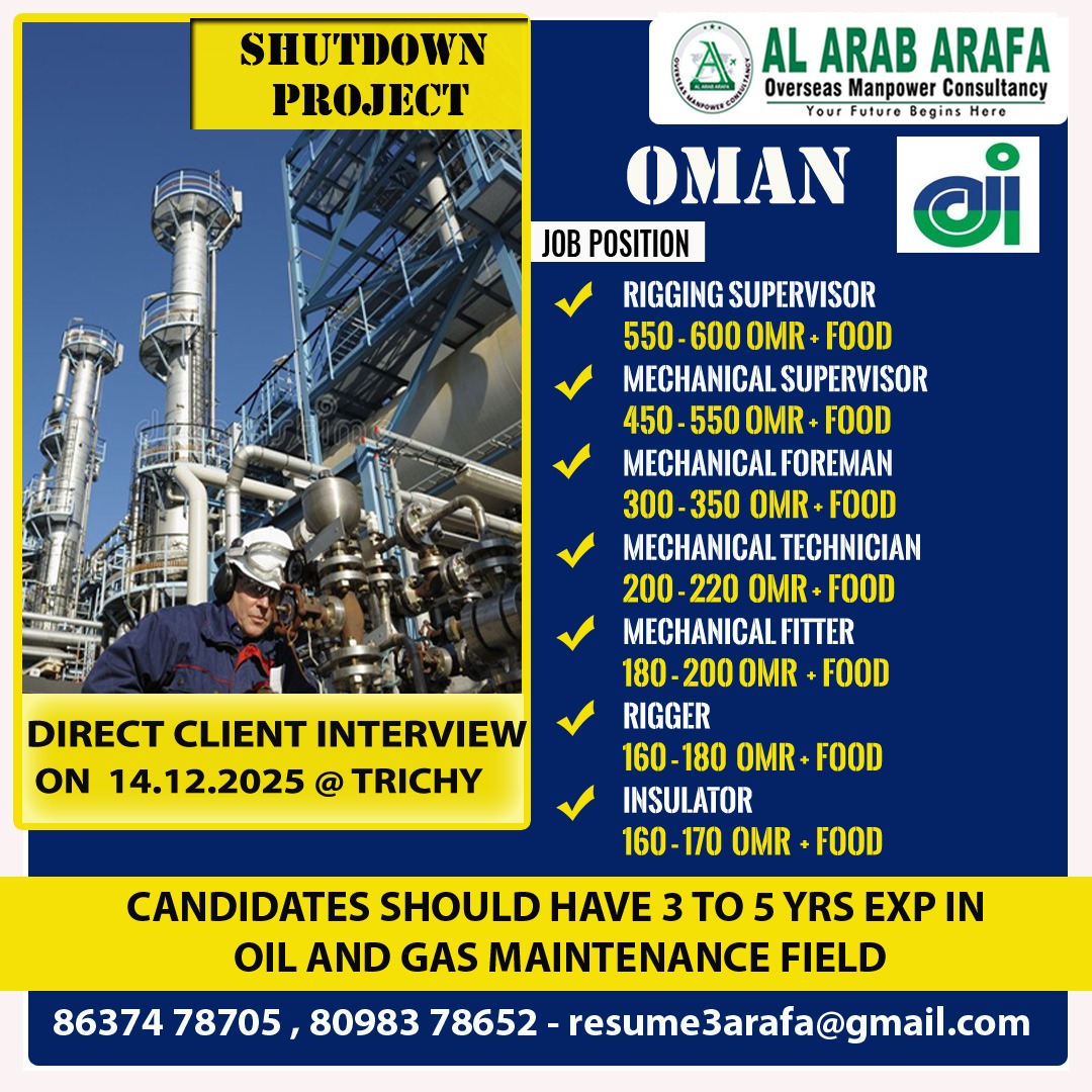 URGENT REQUIREMENT FOR OMAN Interested candidates can share your cv along with all credentials below Mail Id EMAIL: [email protected] CONTACT NO : 9884650919/044-28256001/28256002/28256003