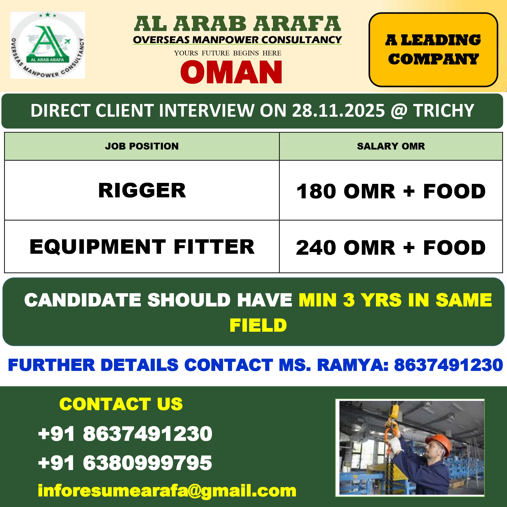 SR NO Position Req No’s SALARY IN OMR 1 CARPENTER-FINISHING 5 85 to 120 2 CARPENTER-SHUTTERING 5 85 to 120 3 GENERAL HELPER 23 65 to 90 4 MASON-CONCRETE FINISHING…