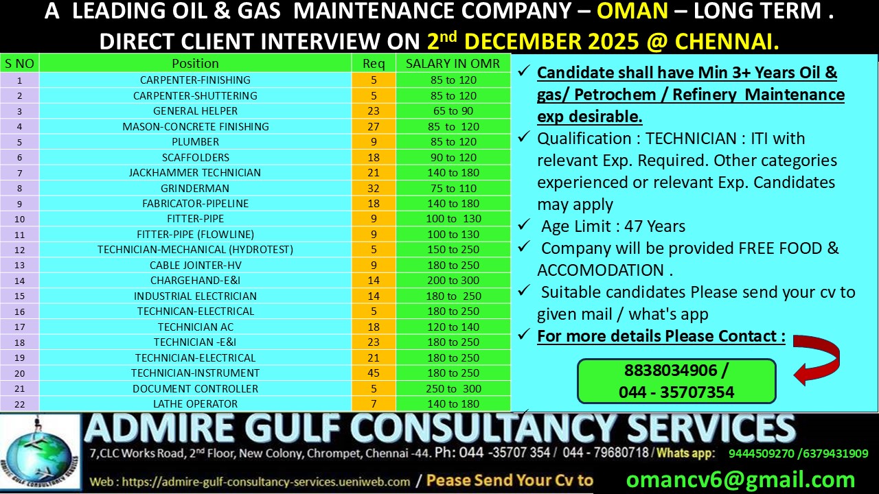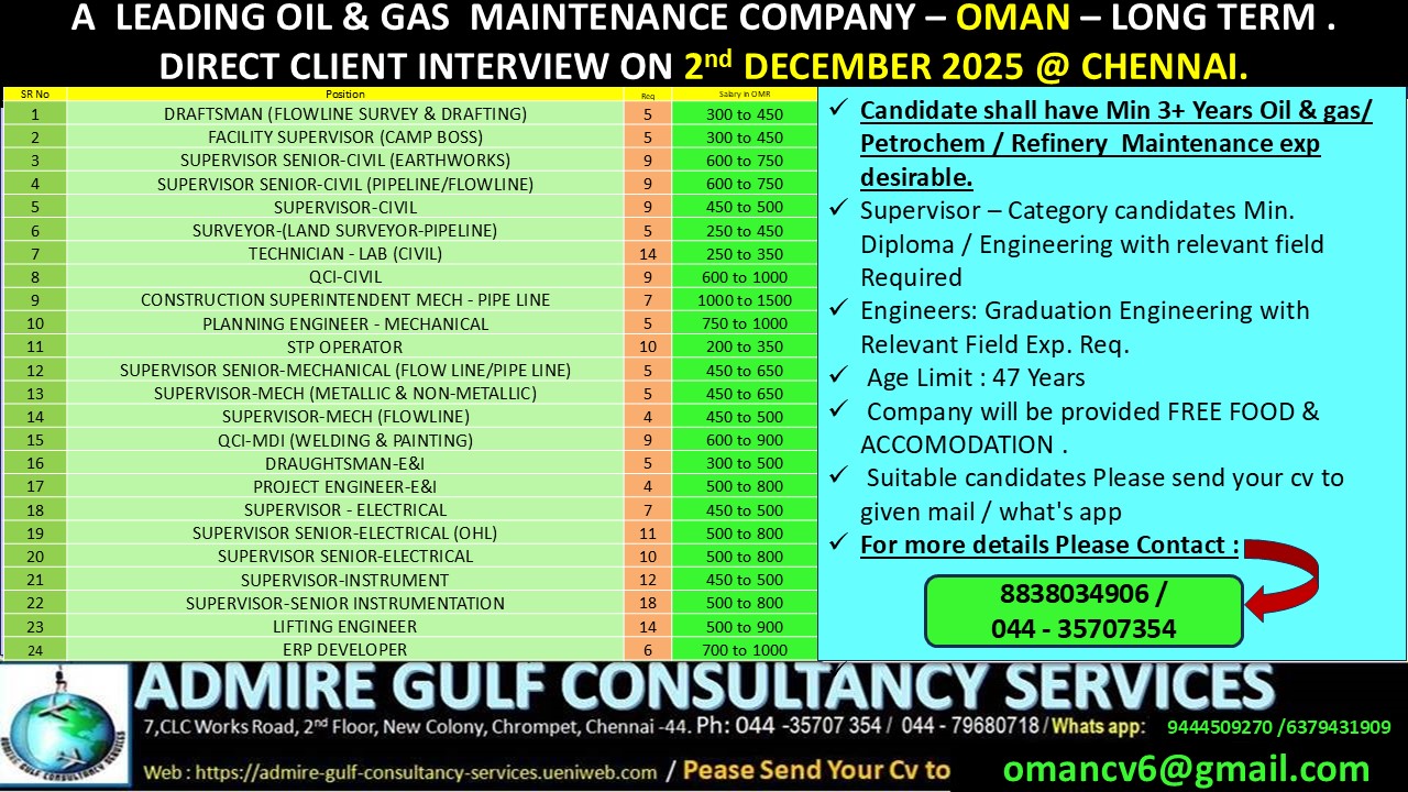 Oil & Gas Pipeline Projects Job Fair in Chennai 📢 ADMIRING GULF CONSULTANCY SERVICES is conducting a direct client interview for a LEADING OIL & GAS PIPELINE PROJECTS company in…