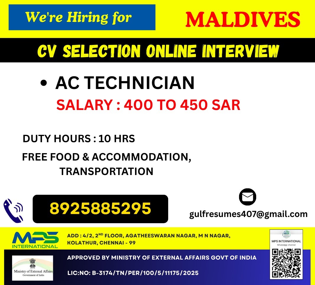 AC TECHNICIAN SALARY: 450 TO 550 FREE FOOD & ACCOMMODATIONGOOD ENGLISH IS REQUIREDAGE LIMIT – BELOW 35 YEARS [email protected] 8925885290