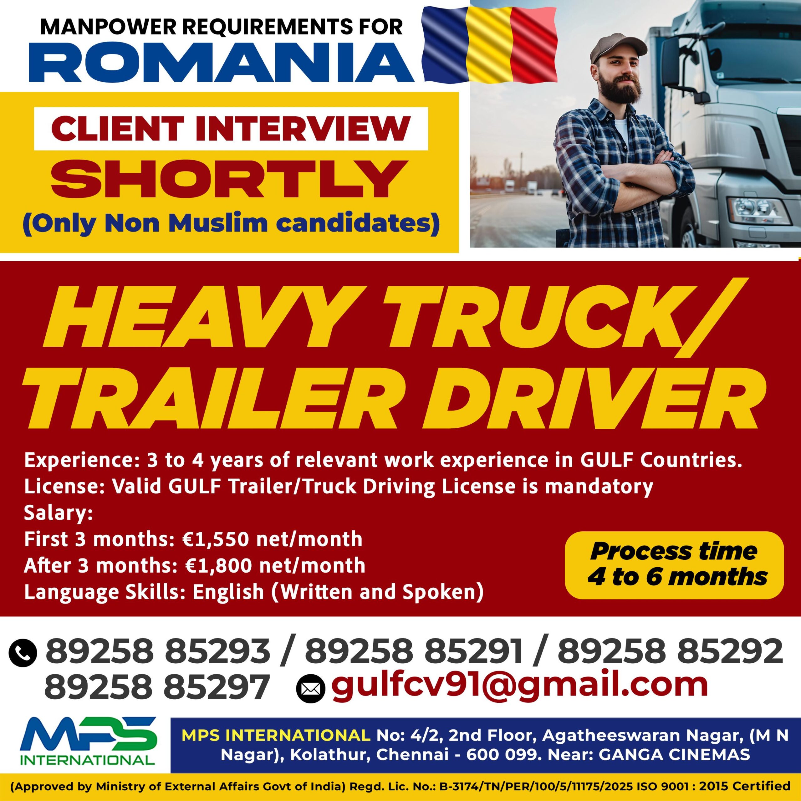 HEAVY TRUCK / TRAILER DRIVER Experience:3 to 4 years of relevant work experience in GULF Countries. License:Valid GULF Trailer/Truck Driving License is mandatory Salary: First 3 months: €1,550 net/month After…