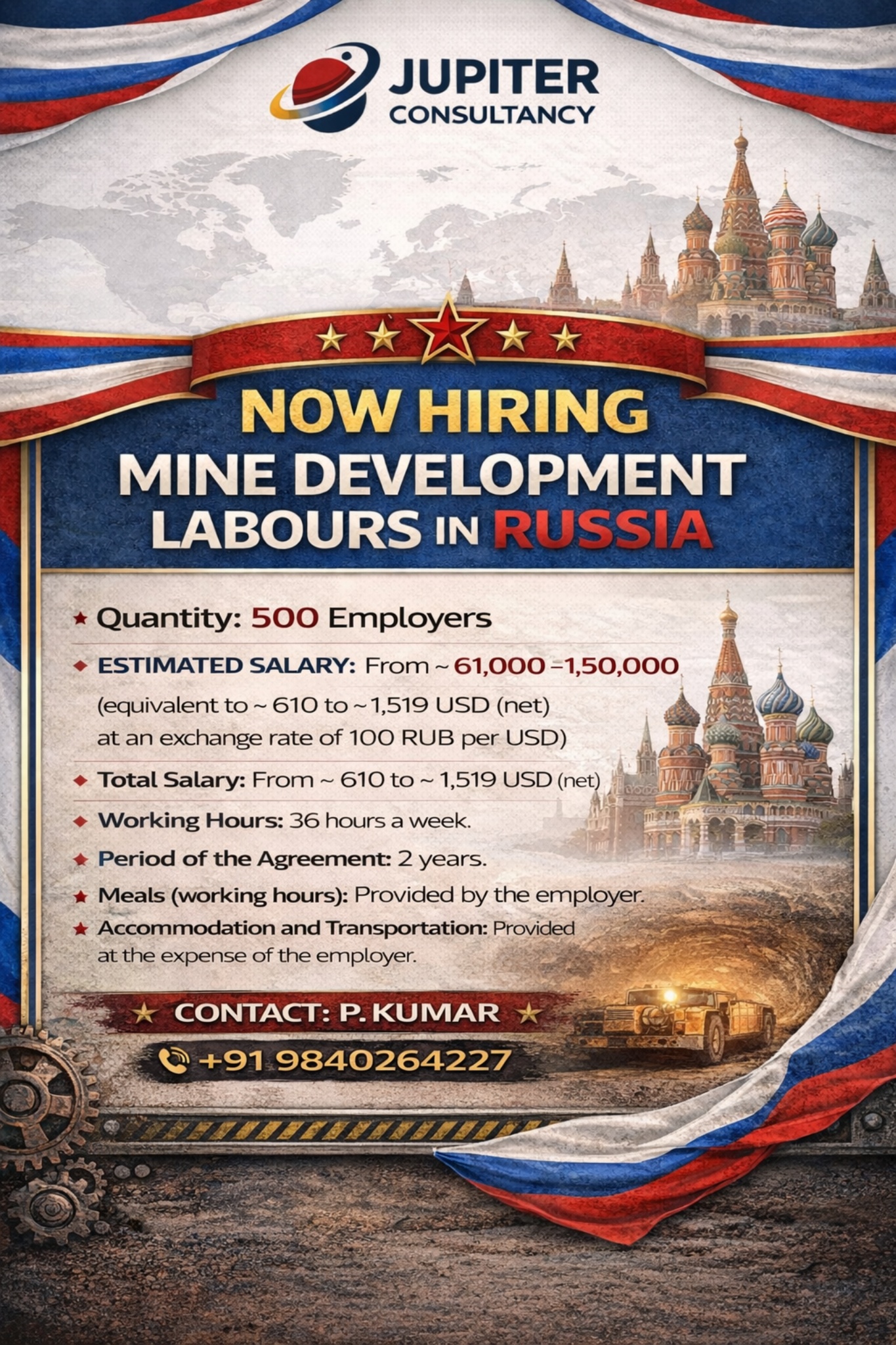 🚨 Urgent Requirement – Russia Project 🇷🇺500 Mine Development Laboure’s Needed✔️ Good Salary | ✔️ 2-Year Contract | ✔️ Employer Benefits📲 Call/WhatsApp: +91 9840264227