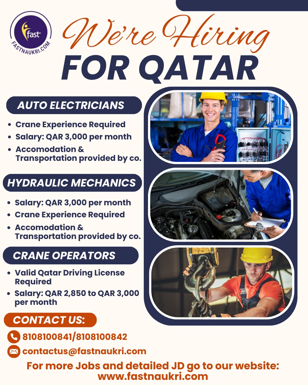 #Hiring 📢 #QatarJobs 🇶🇦 #AutoElectrician ⚡ #HydraulicMechanic 🔧 #CraneOperator 🏗️ #GulfJobs ✈️ #JobAlert 🚨 #WorkInQatar 🇶🇦 #MechanicalJobs 🛠️ #OverseasHiring 🌍 #FastNaukri 🚀 #NowHiring ✅ #ConstructionJobs 🏗️ #JobsInQatar 🏙️ #TechnicalJobs ⚙️…