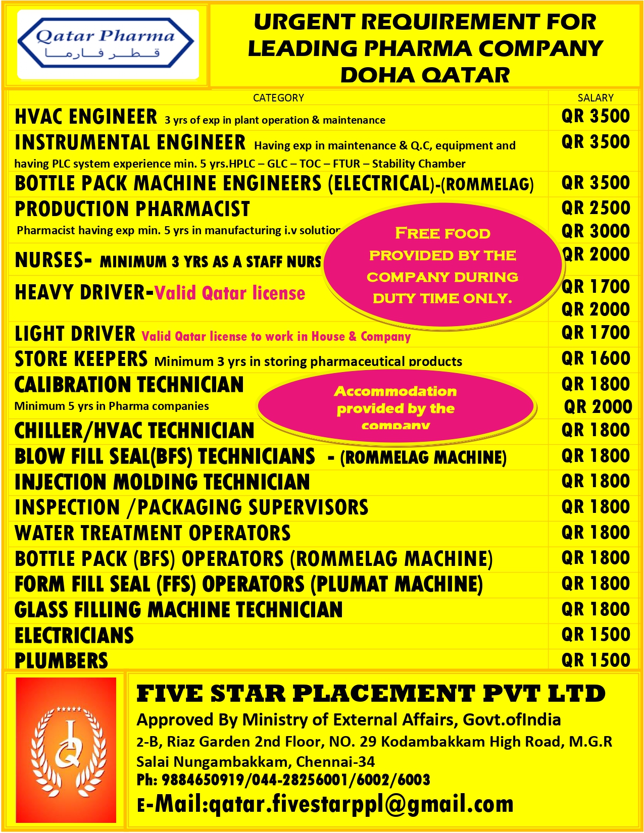 URGENT REQUIREMENT FOR LEADING PHARMA COMPANY DOHA QATAR Interested candidates can share your cv along with all credentials below Mail Id EMAIL:[email protected] CONTACT NO : 9884650919/044-28256001/28256002/28256003