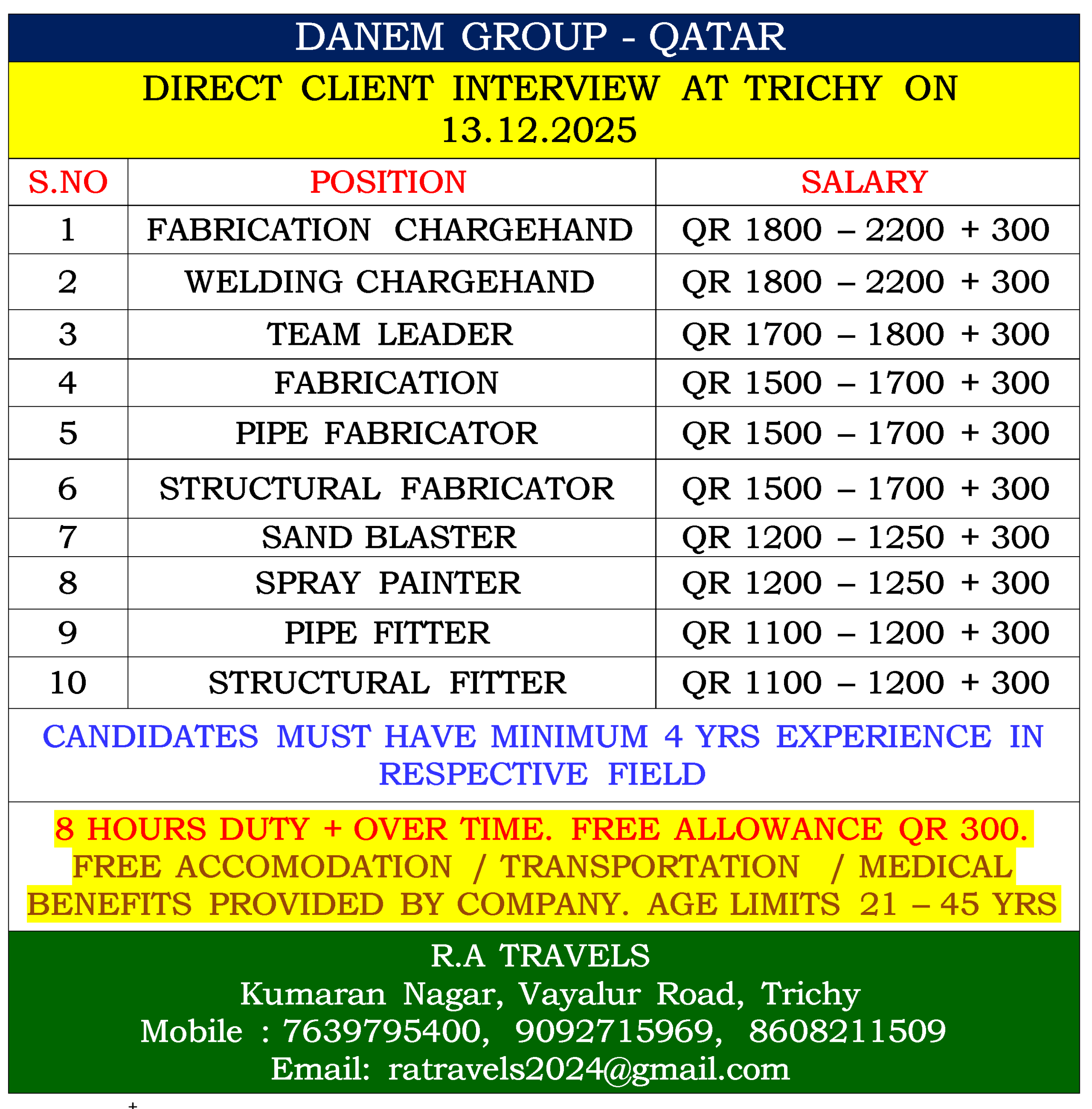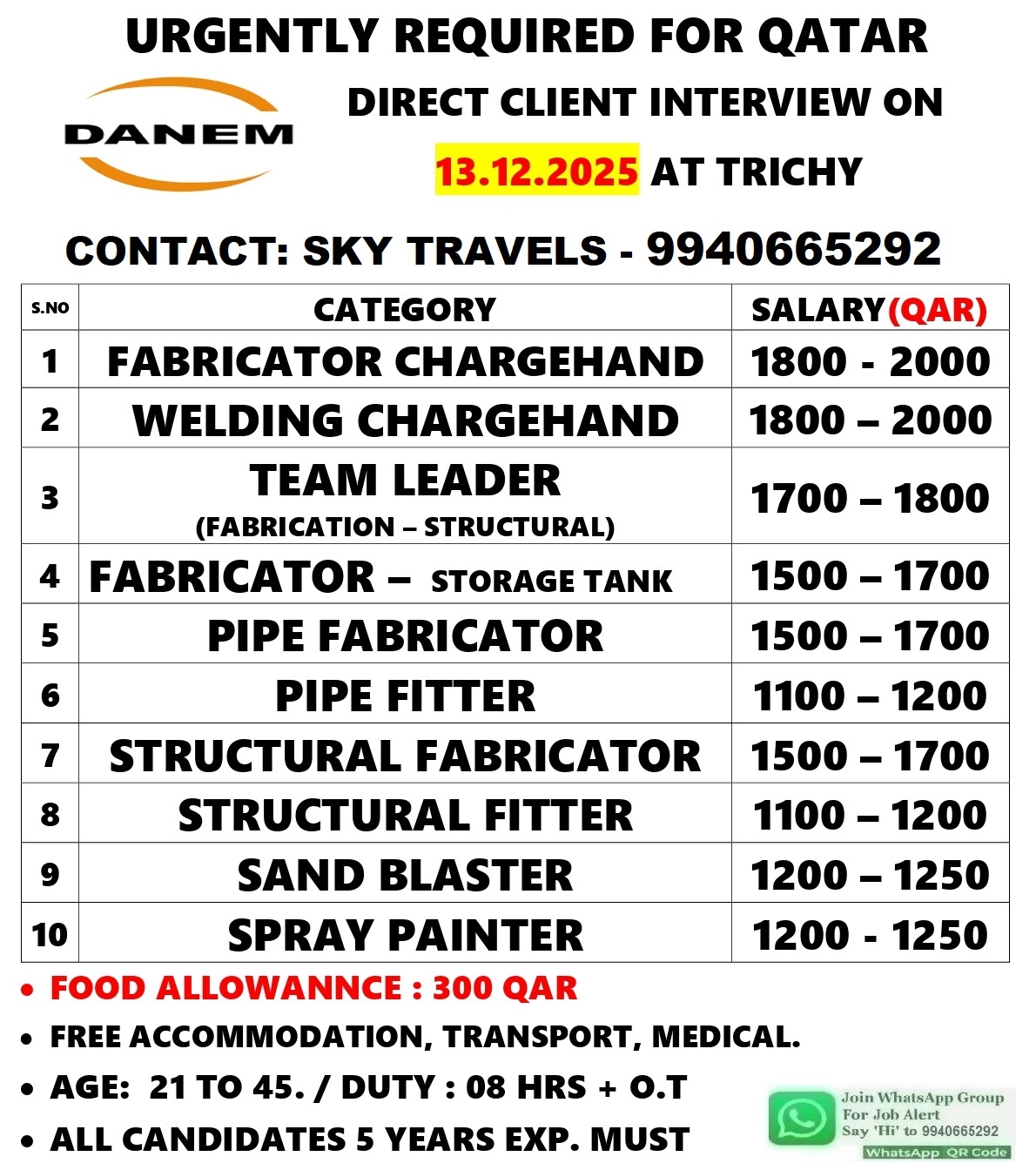 DANEM GROUP – QATAR DIRECT CLIENT INTERVIEW AT TRICHY ON 13.12.2025 S.NO POSITION SALARY 1 FABRICATION CHARGEHAND QR 1800 – 2200 + 300 2 WELDING CHARGEHAND QR 1800 – 2200…