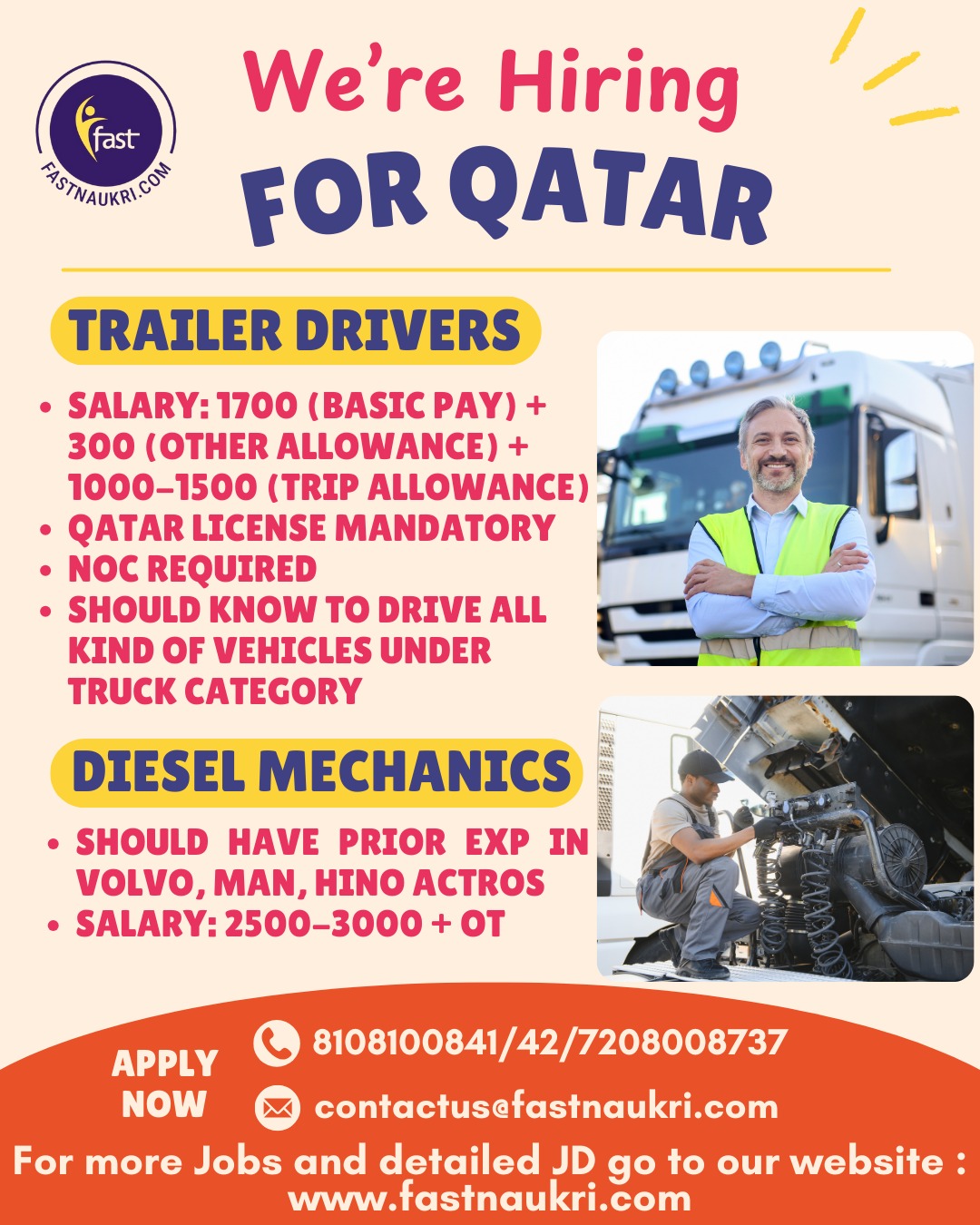 🌍🇶🇦 #HiringForQatar #QatarJobs 🚛 #TrailerDrivers #DieselMechanics 🔧 #GulfJobs #JobOpening 📢 #NowHiring #DriverJobs #MechanicJobs 🛠️ #OverseasJobs #QatarOpportunities 🌟 #ImmediateHiring #ApplyNow 📞 #FastNaukri #WorkAbroad ✈️ #SkilledJobs #TruckDrivers #HeavyVehicleDrivers 🚚 #MechanicalJobs #Volvo #MAN…