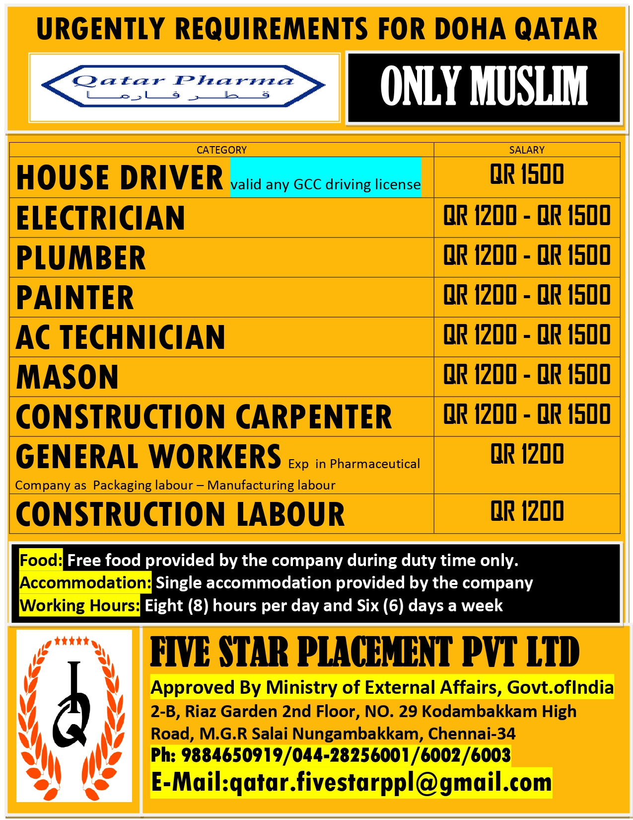 URGENT REQUIREMENT FOR DOHA QATAR Interested candidates can share your cv along with all credentials below Mail Id EMAIL:[email protected] CONTACT NO : 9884650919/044-28256001/28256002/28256003