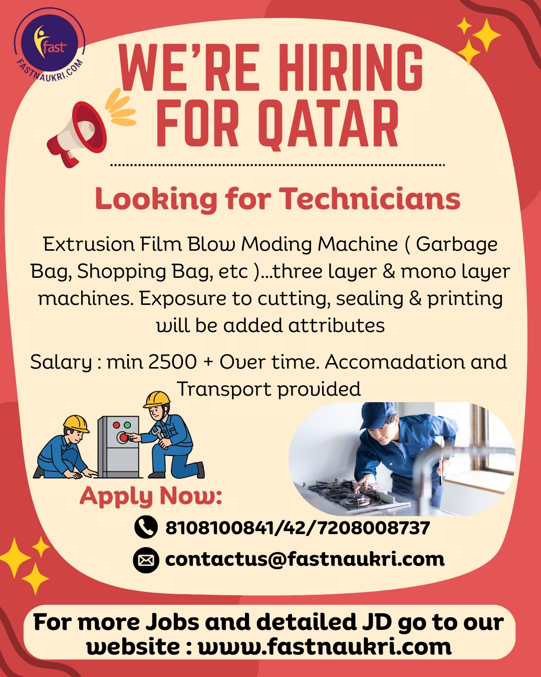🔧👷♂️ #TechnicianJobs 🇶🇦💼 #HiringForQatar 🏭🛠️ #ExtrusionMachine 🧰🔩 #BlowMoldingMachine 🛍️🗑️ #BagMakingMachine ⚙️📦 #ThreeLayerMachine ⚙️🧵 #MonoLayerMachine ✂️🔧 #CuttingAndSealing 🖨️⚙️ #PrintingExposure 🌍✈️ #GulfJobs 💼🚀 #QatarHiring 🏘️🚐 #AccommodationAndTransport 📞💬 #ApplyNow 🧑🏭🔧 #SkilledTechnicians 🏭👨🔧 #IndustrialJobs…
