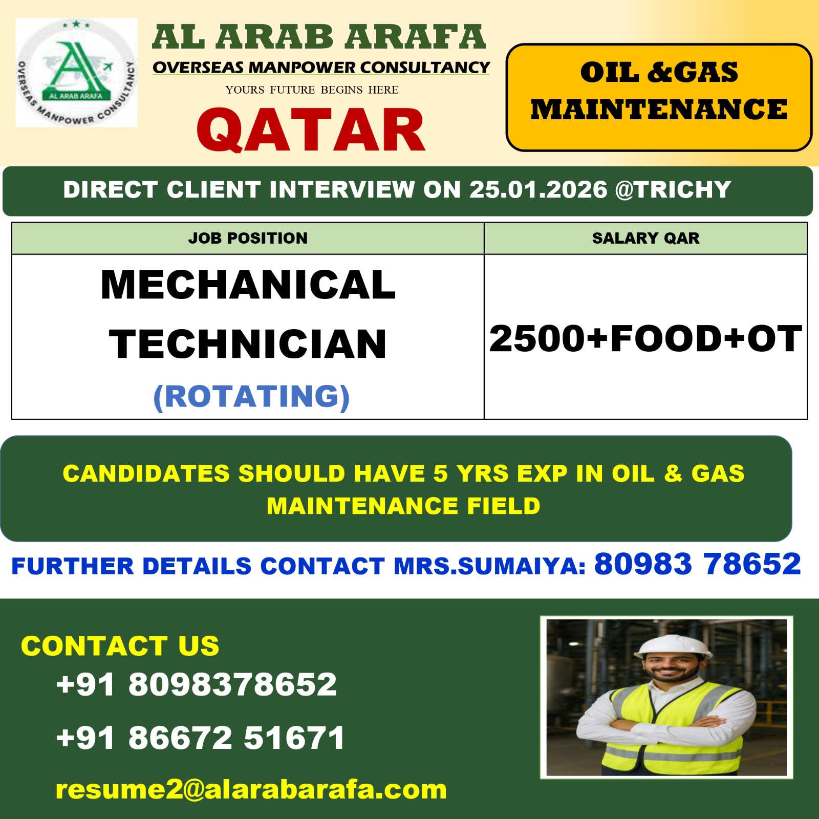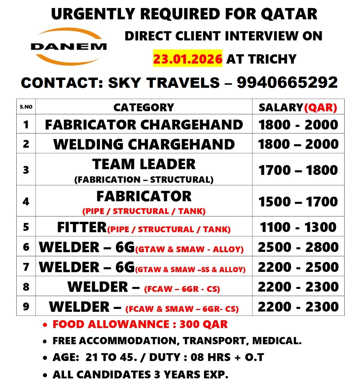 Direct client walk-in interviews for Qatar Shutdown Projects in Chennai on 20th January ✈️Vacancies in large numbers for Oil & Gas professionals.💯 Free Recruitment – No charges at any stage.…