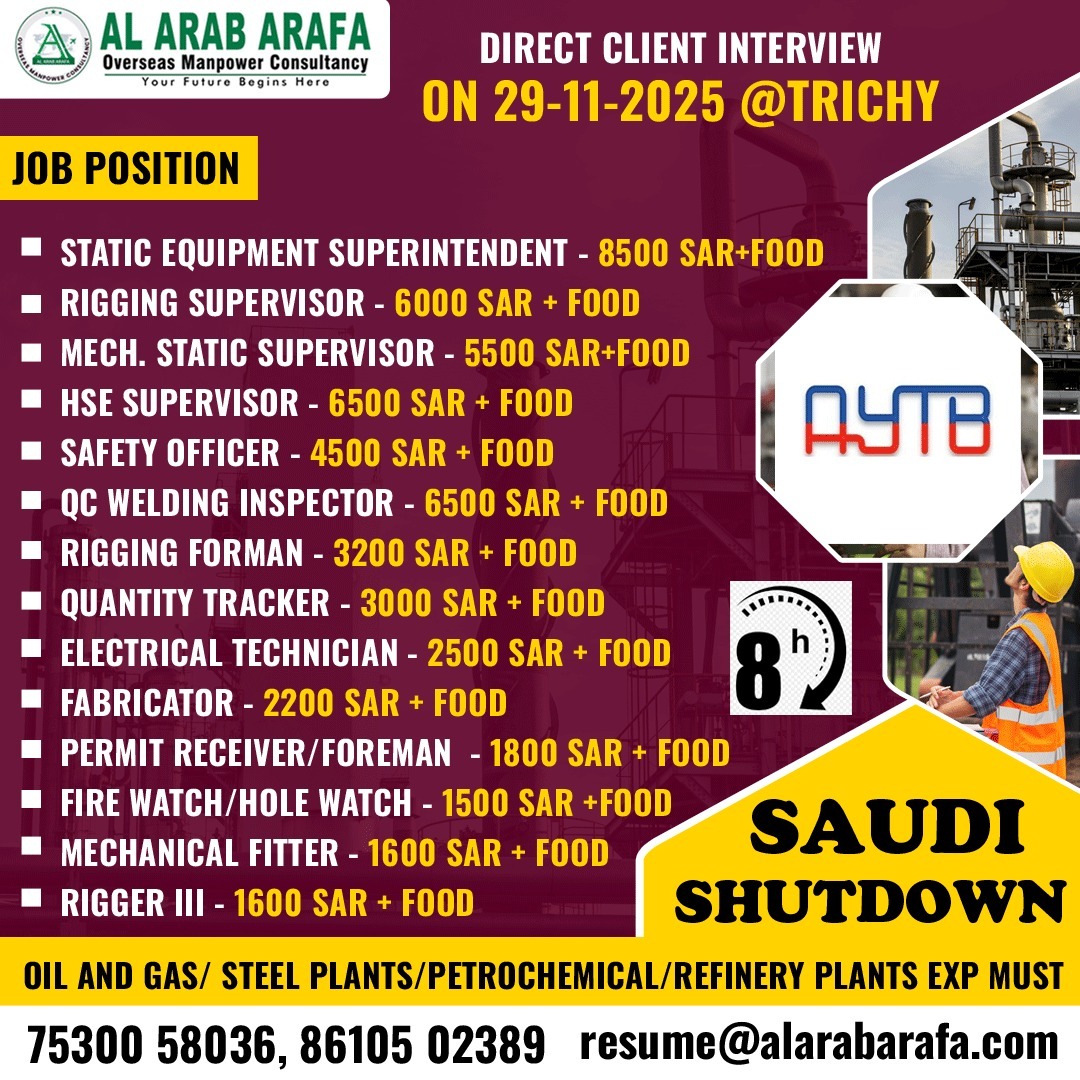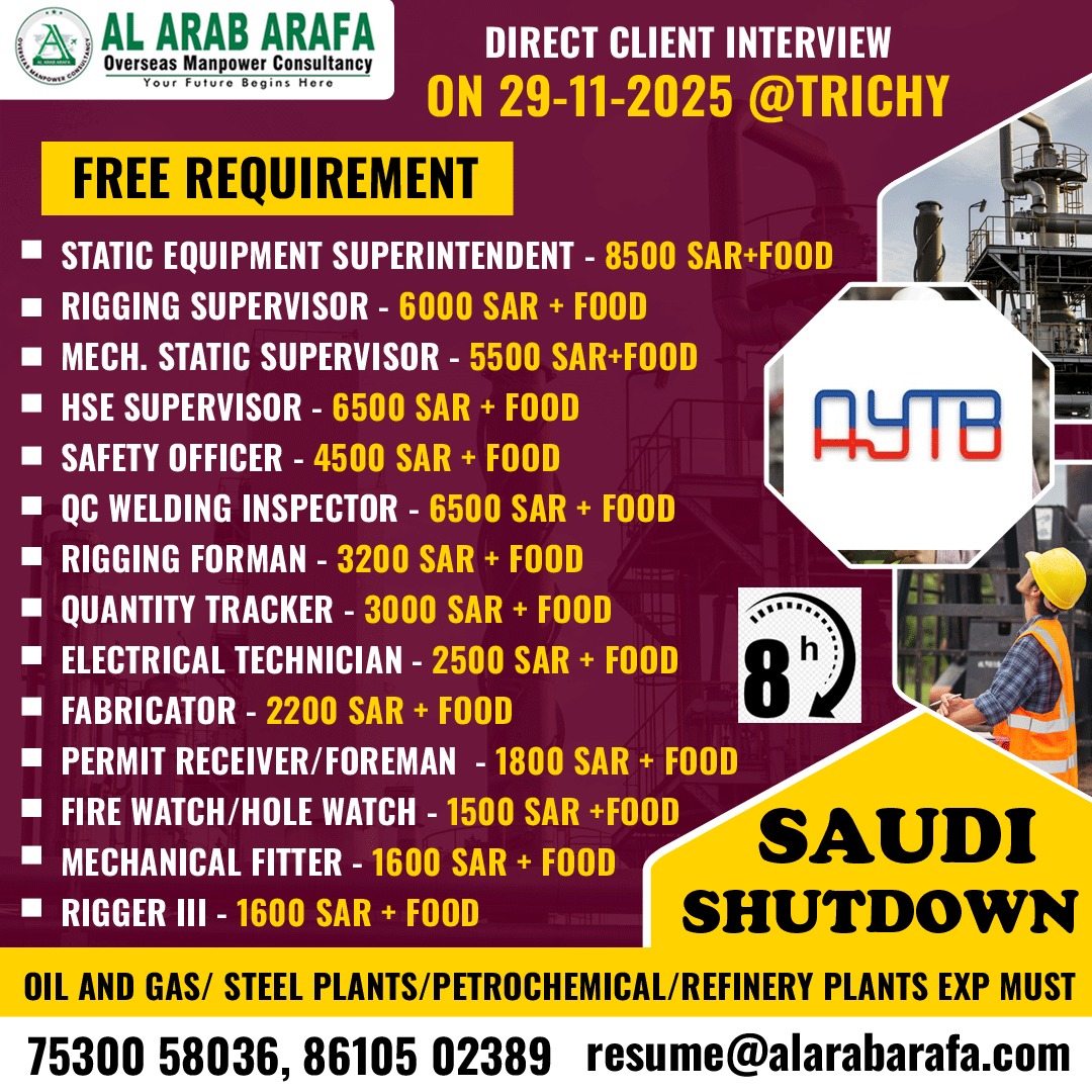 For more details: please call: 9620992294-8277795307 Please like & join us: https://www.facebook.com/welcometosaad https://www.instagram.com/saddconsultancy_jobs/ https://t.me/saadgulfjobshttps://www.linkedin.com/in/abroadjobshttps://twitter.com/saadgulfjobs