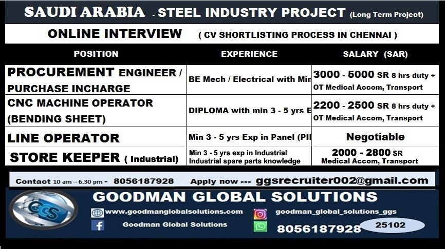 SAUDI ARABIA – STEEL INDUSTRY PROJECT (Long Term Project) ONLINE INTERVIEW ( CV SHORTLISTING PROCESS IN CHENNAI ) CONTACT – 8056187928 APPLY NOW>>> [email protected] 2200 – 5000 SR Negotiable +…