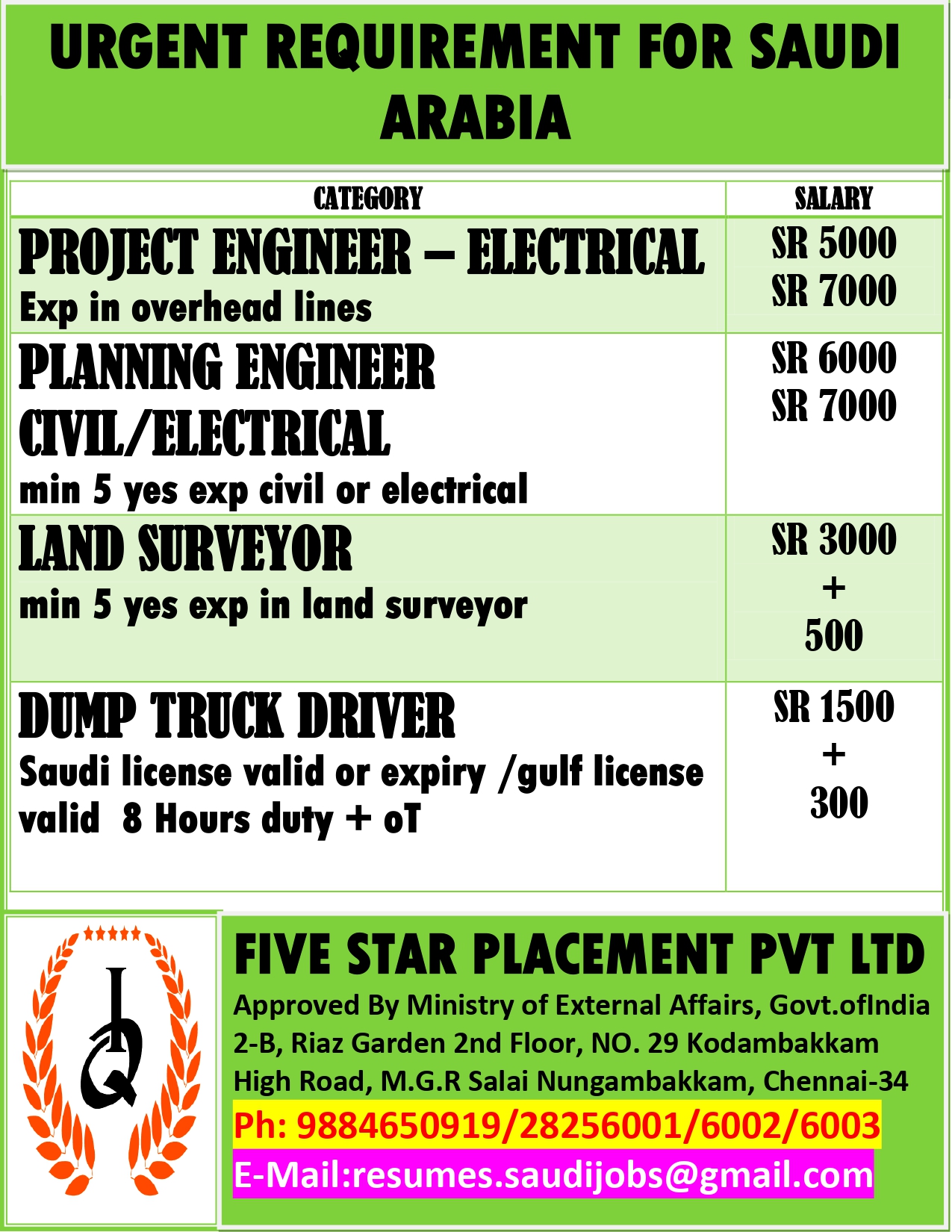 URGENT REQUIREMENT FOR SAUDI ARABIA Interested candidates can share your cv along with all credentials below Mail Id EMAIL:[email protected] CONTACT NO : 9884650919