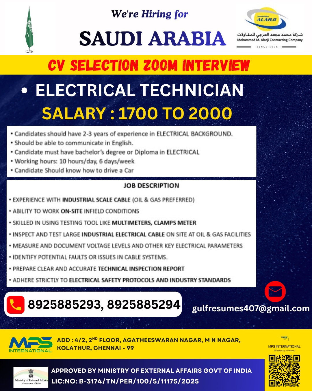 FREE REQUIREMENT FOR SAUDI ARABIA Interested candidates can share your cv along with all credentials below Mail Id EMAIL:[email protected] CONTACT NO : 9884650919