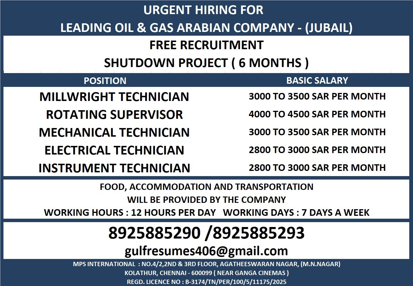FOOD, ACCOMMODATION AND TRANSPORTATIONWILL BE PROVIDED BY THE COMPANY WORKING HOURS: 12 HOURS PER DAYWORKING DAYS: 7 DAYS A WEEK 8925885290 / 8925885293 [email protected]