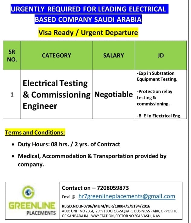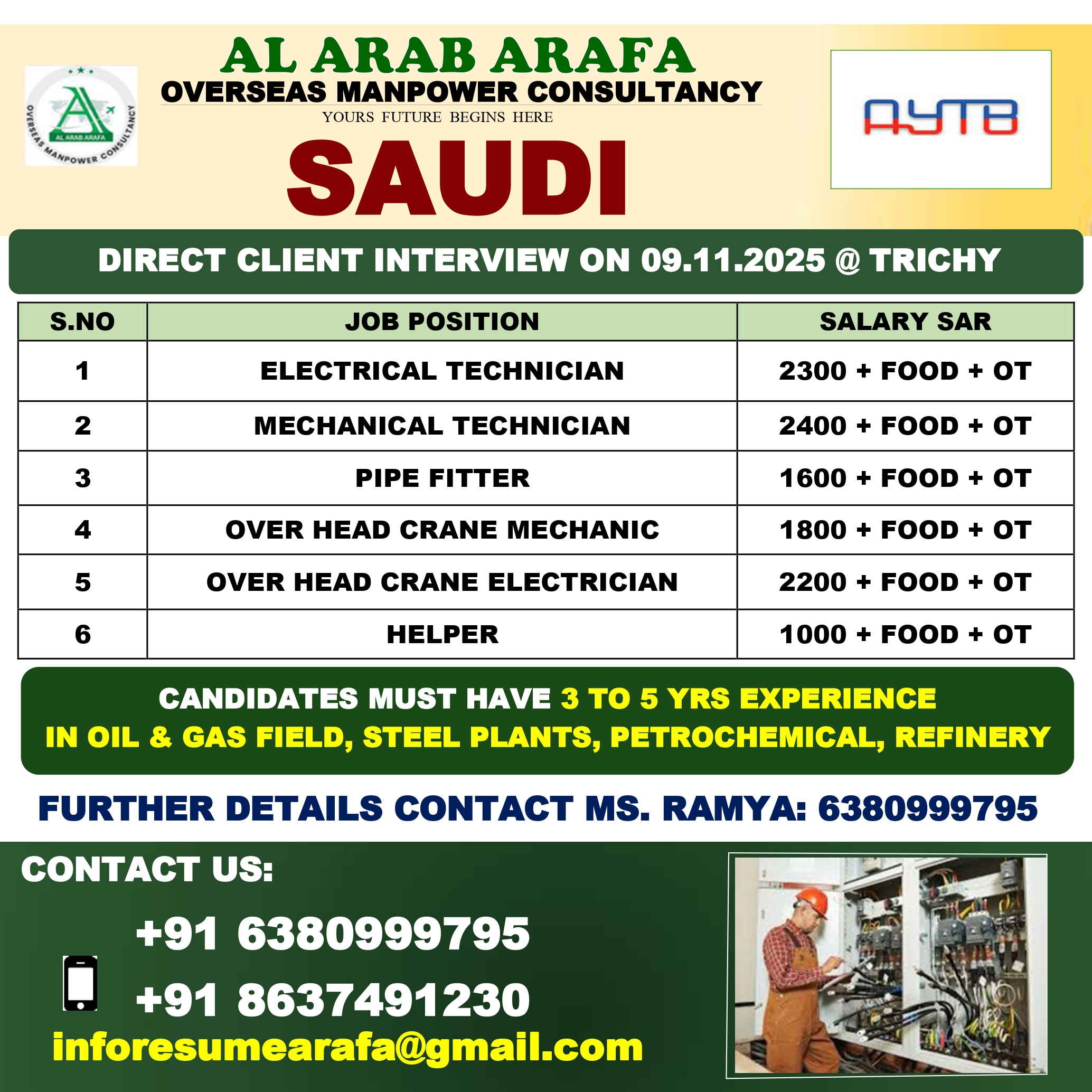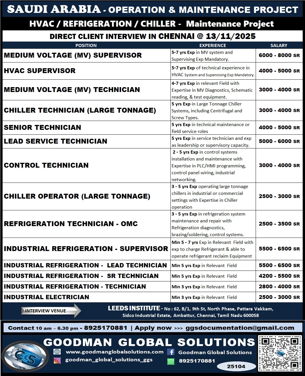 SAUDI ARABIA – OPERATION & MAINTENANCE PROJECT HVAC / REFRIGERATION / CHILLER – MAINTENANCE DIRECT CLIENT INTERVIEW IN CHENNAI @ 13 NOV 2025 CONTACT – 8925170881 WHATSAPP APPLY NOW>>> [email protected]…