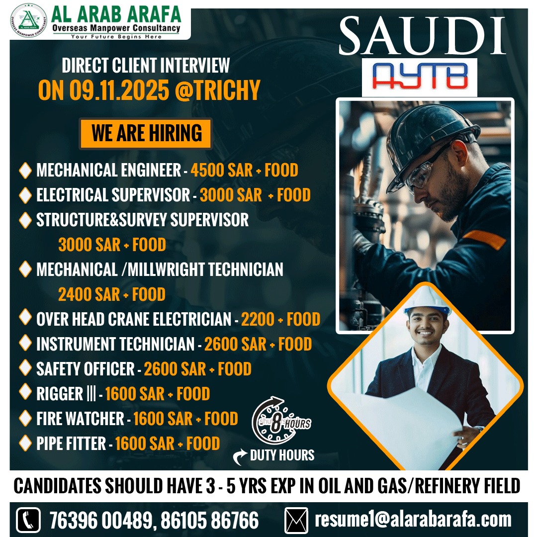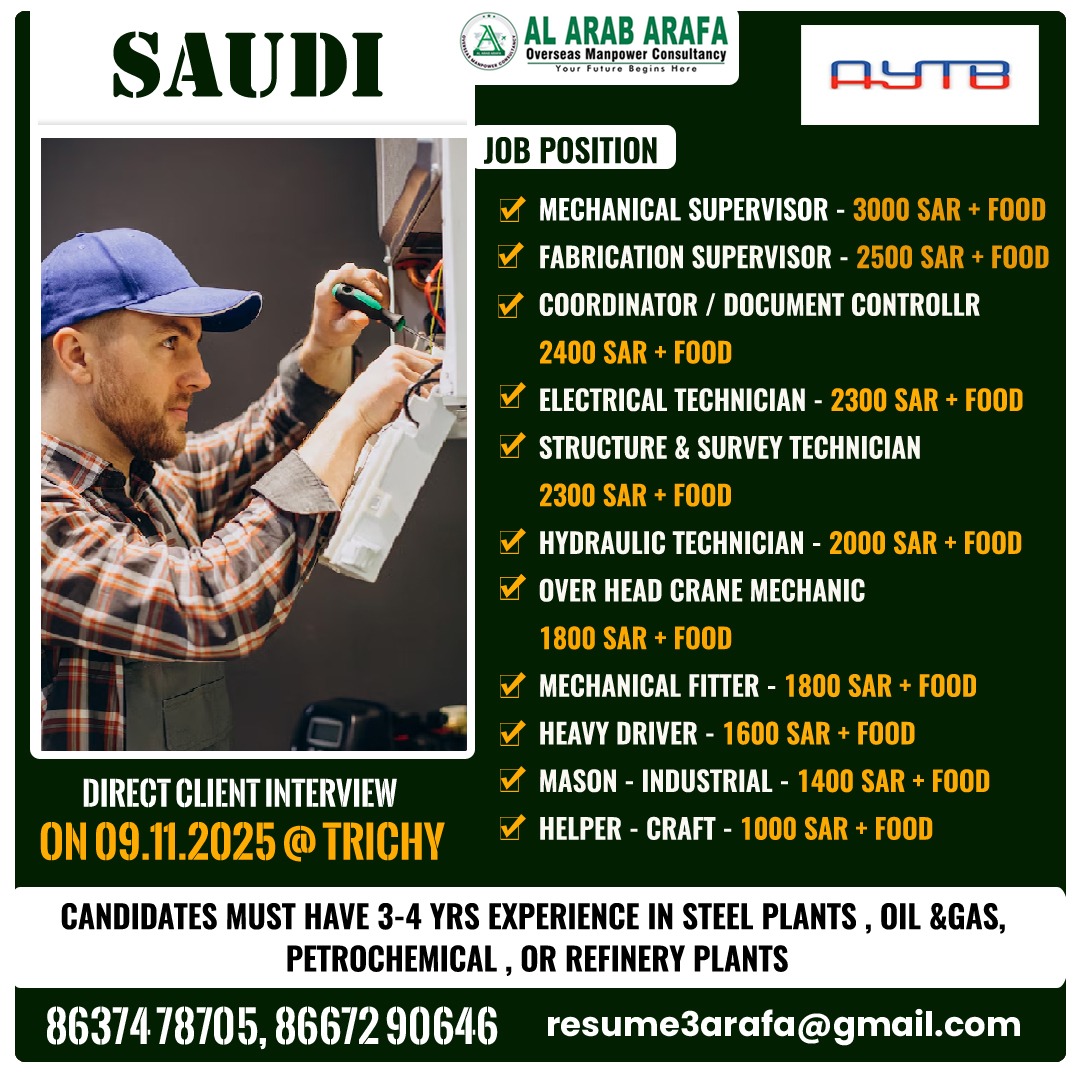INDUSTRIAL GROUP SAUDI ARABIA – STEEL INDUSTRY PROJECT (Long Term Project) ONLINE INTERVIEW ( CV SHORTLISTING PROCESS IN CHENNAI ) CONTACT – 8056187928 APPLY NOW>>> [email protected] 2200 – 5000 SR…