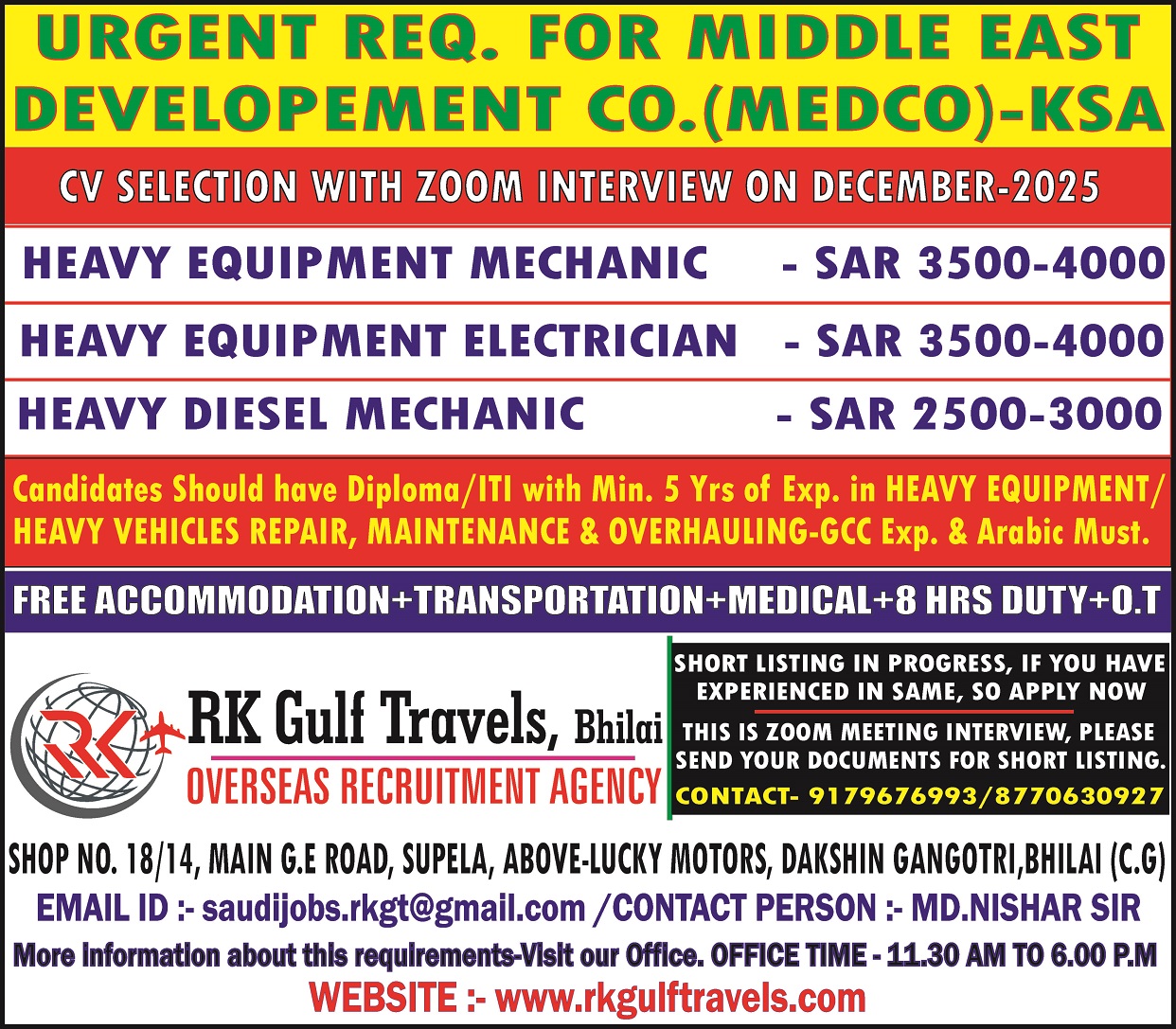 GREETINGS FROM RK GULF TRAVELS, BHILAI. HIRING FOR A LEADING COMPANY (MEDCO) – KSA. ZOOM MEETING INTERVIEW ON DECEMBER-2025 CANDIDATES SHOULD HAVE MINIMUM 5-6 YEARS EXPERIENCE IN RELEVANT FIELD &…