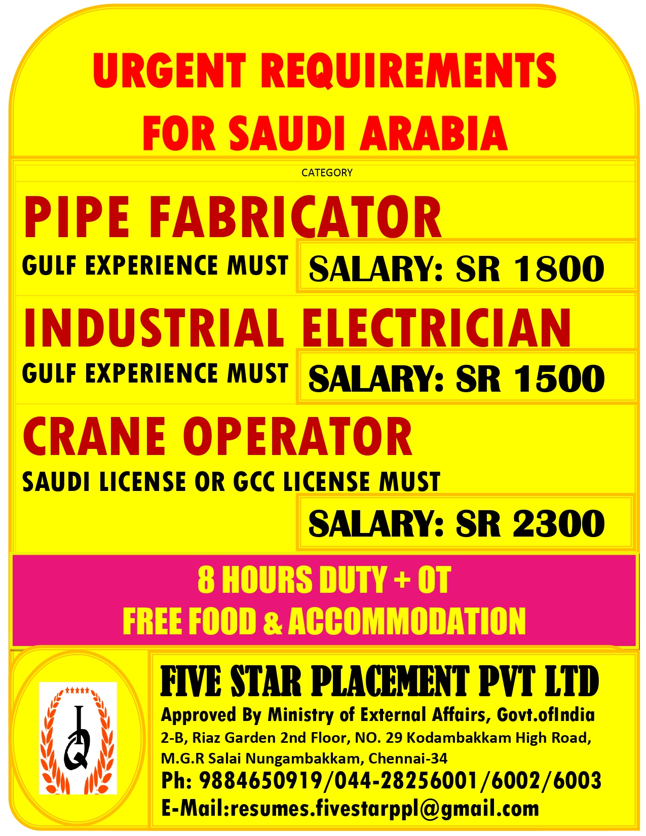 URGENT REQUIREMENT FOR SAUDI ARABIA Interested candidates can share your cv along with all credentials below Mail IdEMAIL:[email protected] NO : 9884650919/044-28256001/28256002/28256003
