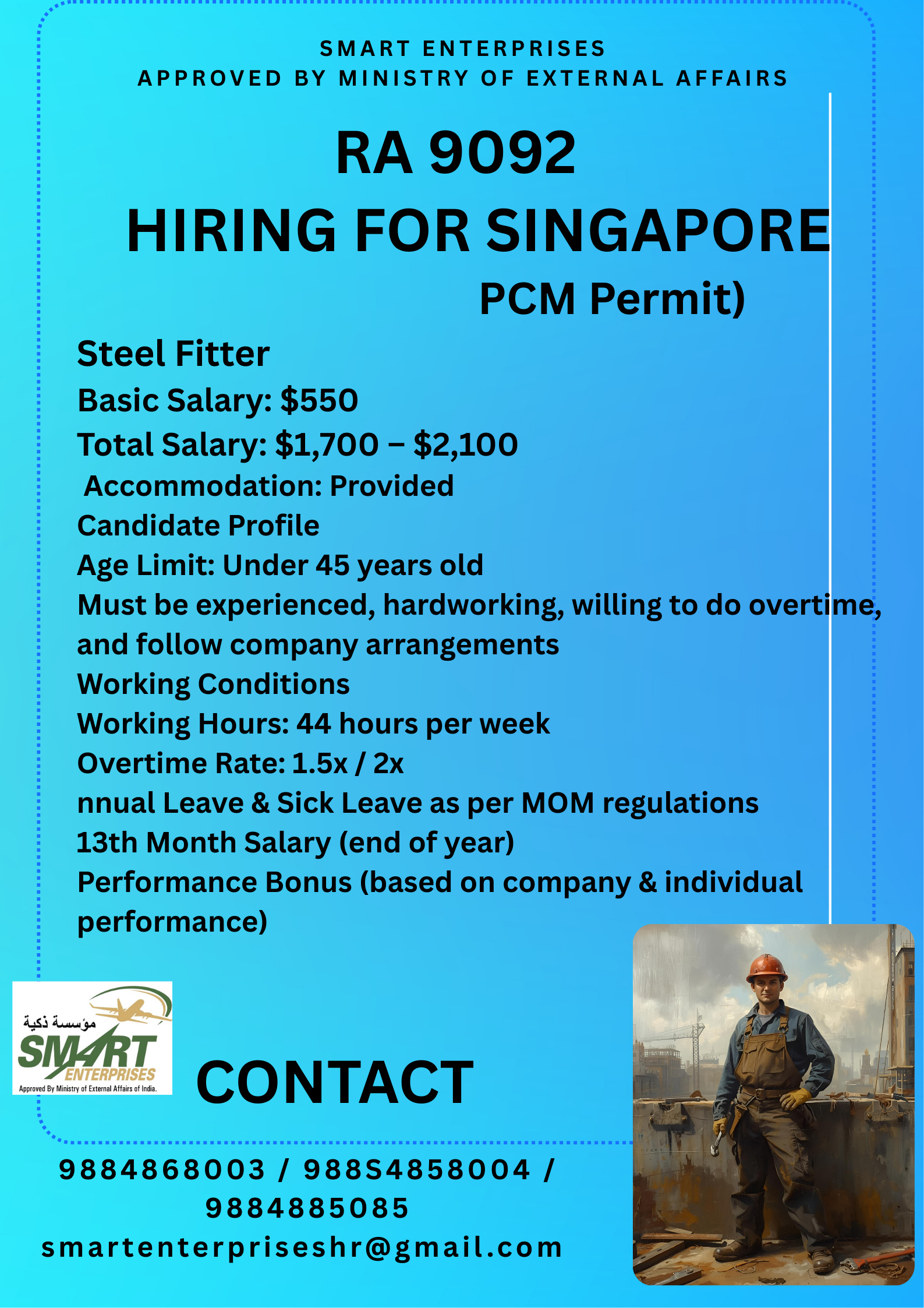 HIRING FOR SINGAPORE RA 9092 PCM Permit Steel Fitter Basic Salary: $550 Total Salary: $1,700 – $2,100 Accommodation: Provided Candidate Profile Age Limit: Under 45 years old Must be experienced,…