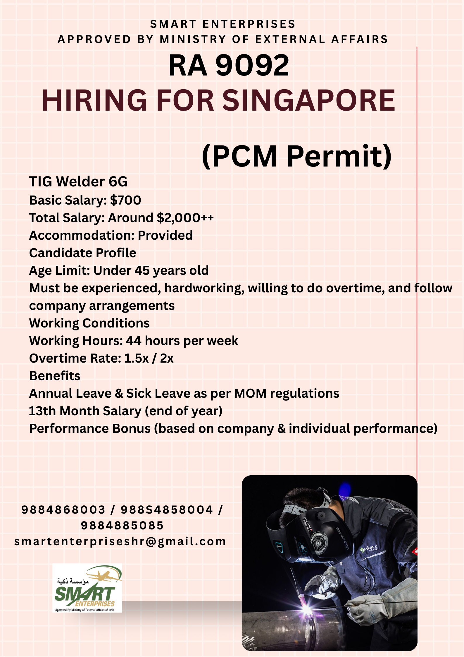 HIRING FOR SINGAPORE RA 9092 TIG Welder 6G Basic Salary: $700 Total Salary: Around $2,000++ Accommodation: Provided Candidate Profile Age Limit: Under 45 years old Must be experienced, hardworking, willing…
