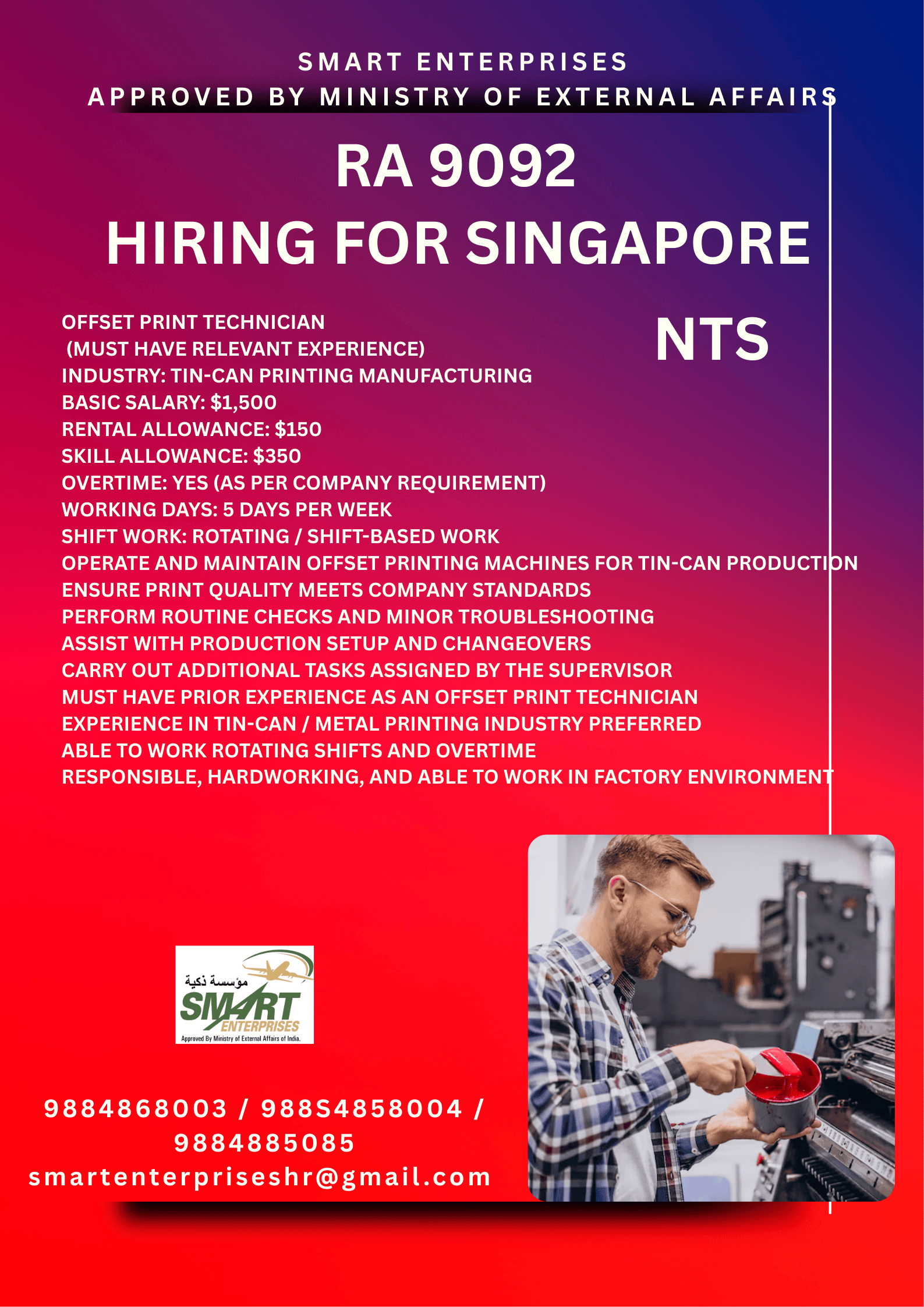 HIRING FOR SINGAPORE RA 9092 NTS Offset Print Technician (Must Have Relevant Experience) Industry: Tin-Can Printing Manufacturing Basic Salary: $1,500 Rental Allowance: $150 Skill Allowance: $350 Overtime: Yes (as per…