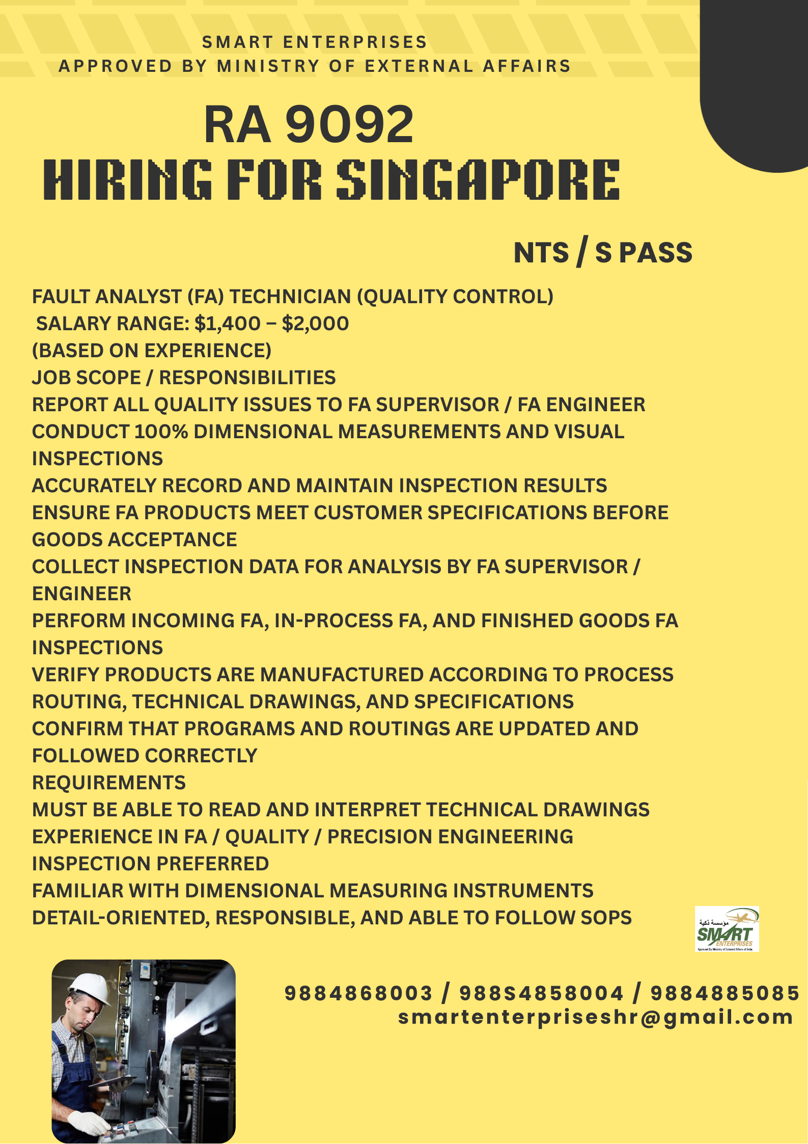 HIRING FOR SINGAPORE RA 9092 NTS / S PASS Fault Analyst (FA) Technician (Quality Control) Salary Range: $1,400 – $2,000 (Based on experience) Job Scope / Responsibilities Report all quality…