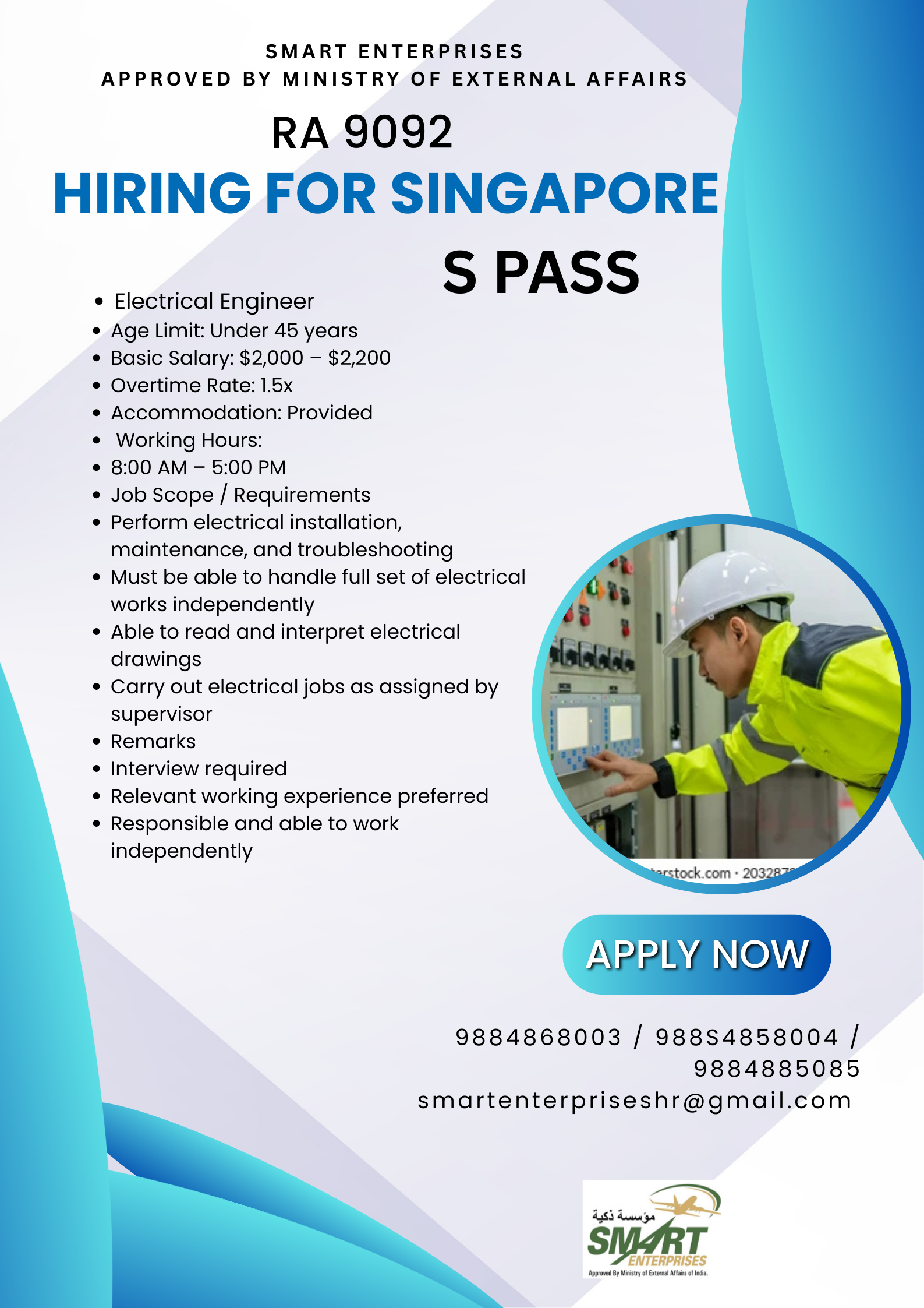 HIRING FOR SINGAPORE RA 9092 S PASS Electrical Engineer Age Limit: Under 45 years Basic Salary: $2,000 – $2,200 Overtime Rate: 1.5x Accommodation: Provided Working Hours: 8:00 AM – 5:00…