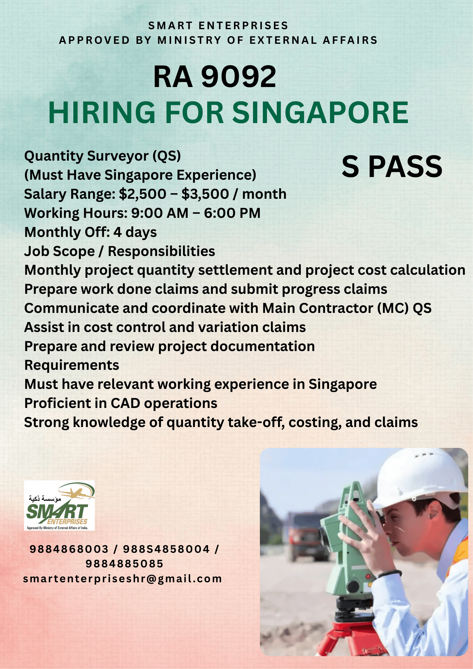 HIRING FOR SINGAPORE RA 9092 Quantity Surveyor (QS) (Must Have Singapore Experience) Salary Range: $2,500 – $3,500 / month Working Hours: 9:00 AM – 6:00 PM Monthly Off: 4 days…