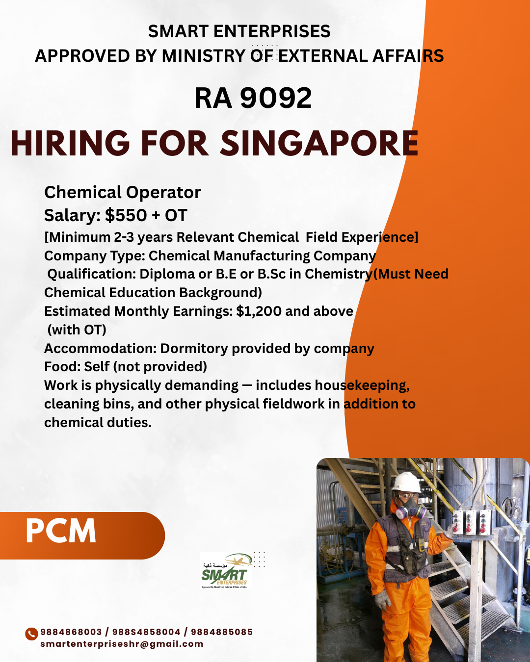HIRING FOR SINGAPORE RA 9092 PCM Chemical Operator Salary: $550 + OT Company Type: Chemical Manufacturing Company Qualification: Diploma or B.E or B.Sc in Chemistry(Must Need Chemical Education Background) Estimated…