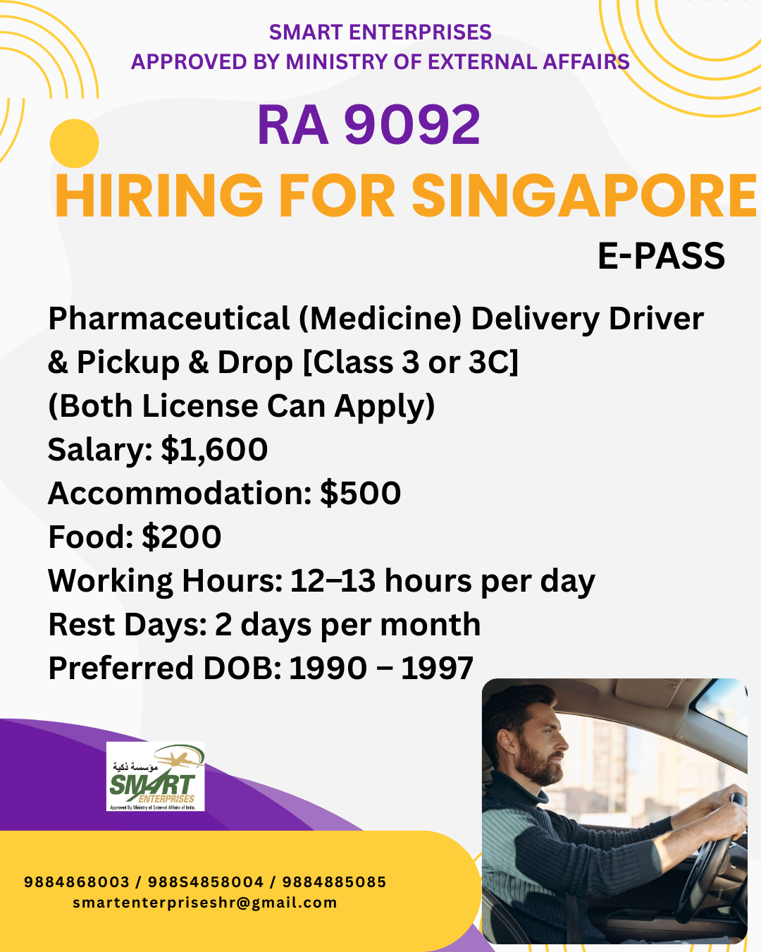HIRING FOR SINGAPORE RA 9096 E PASS Pharmaceutical (Medicine) Delivery Driver & Pickup & Drop (Both License Can Apply) Salary: $1,600 Accommodation: $500 Food: $200 Working Hours: 12–13 hours per…