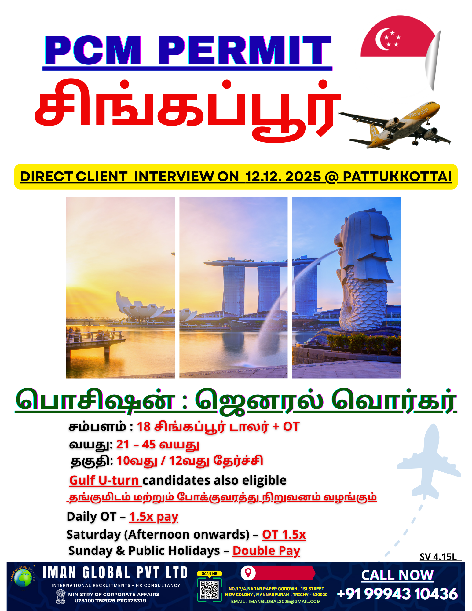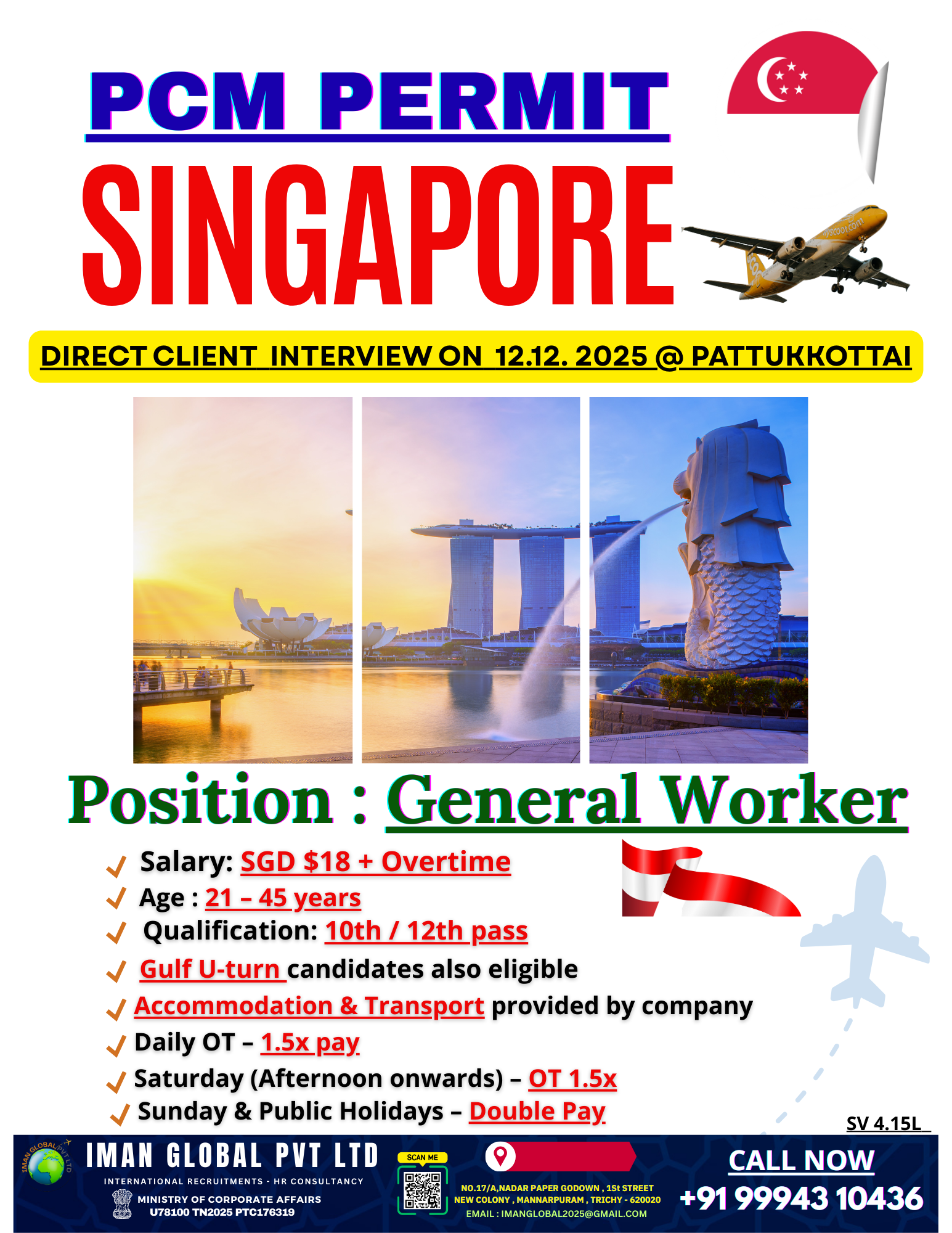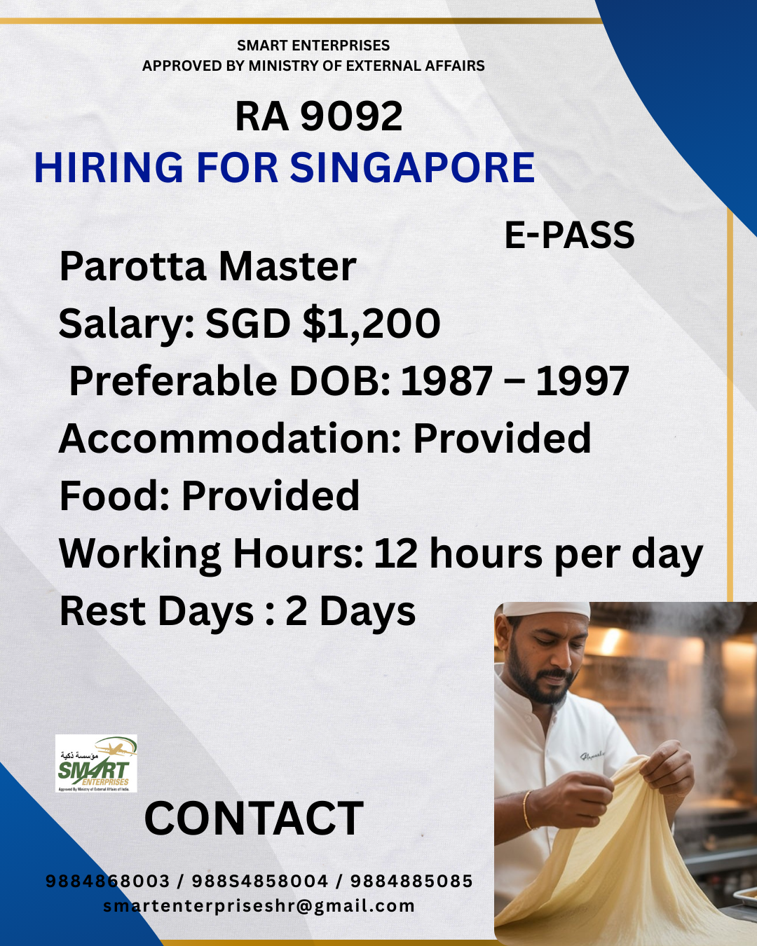 HIRING FOR SINGAPORE RA 9092 E PASS Parotta Master Salary: SGD $1,200 Preferable DOB: 1987 – 1997 Accommodation: Provided Food: Provided Working Hours: 12 hours per day Rest Days :…