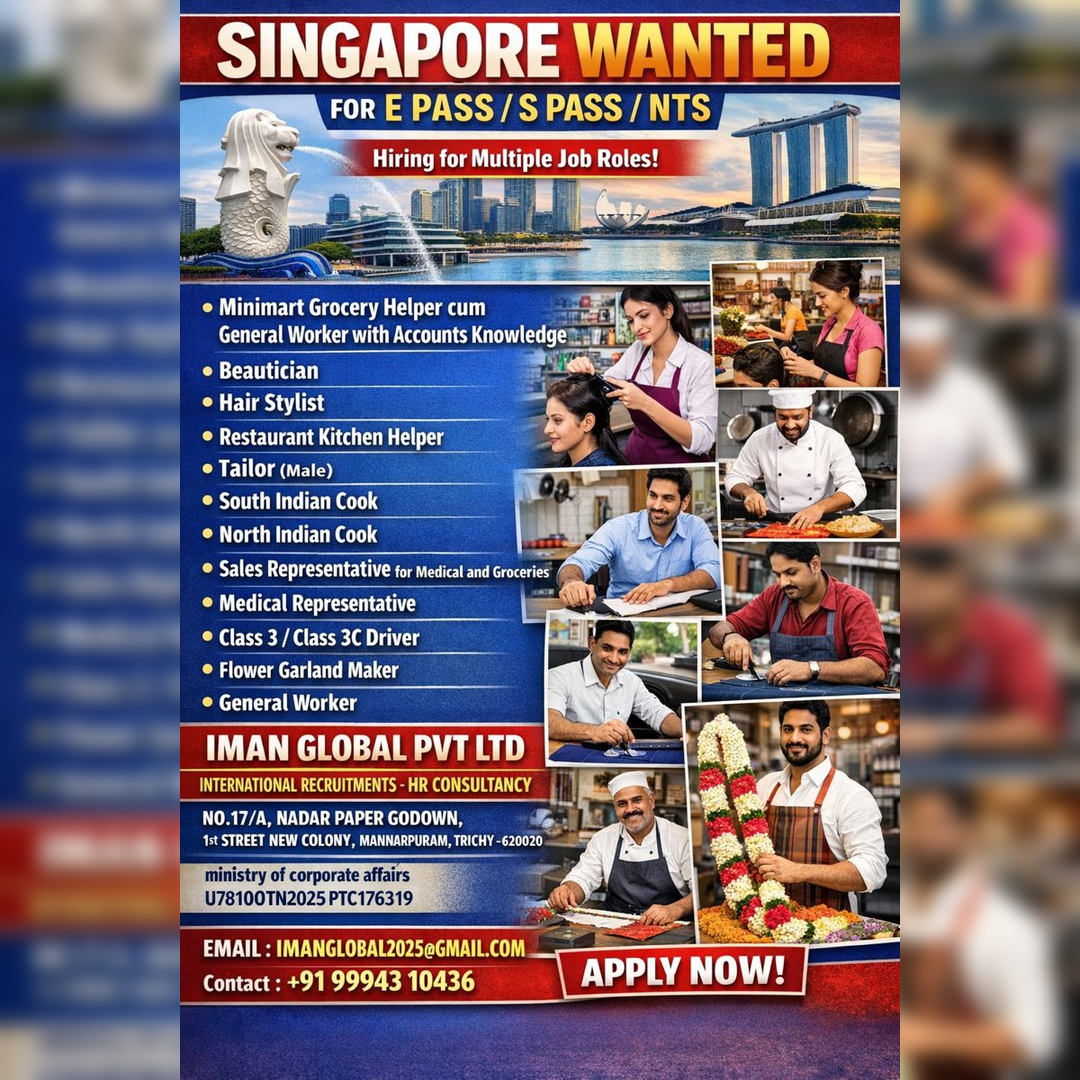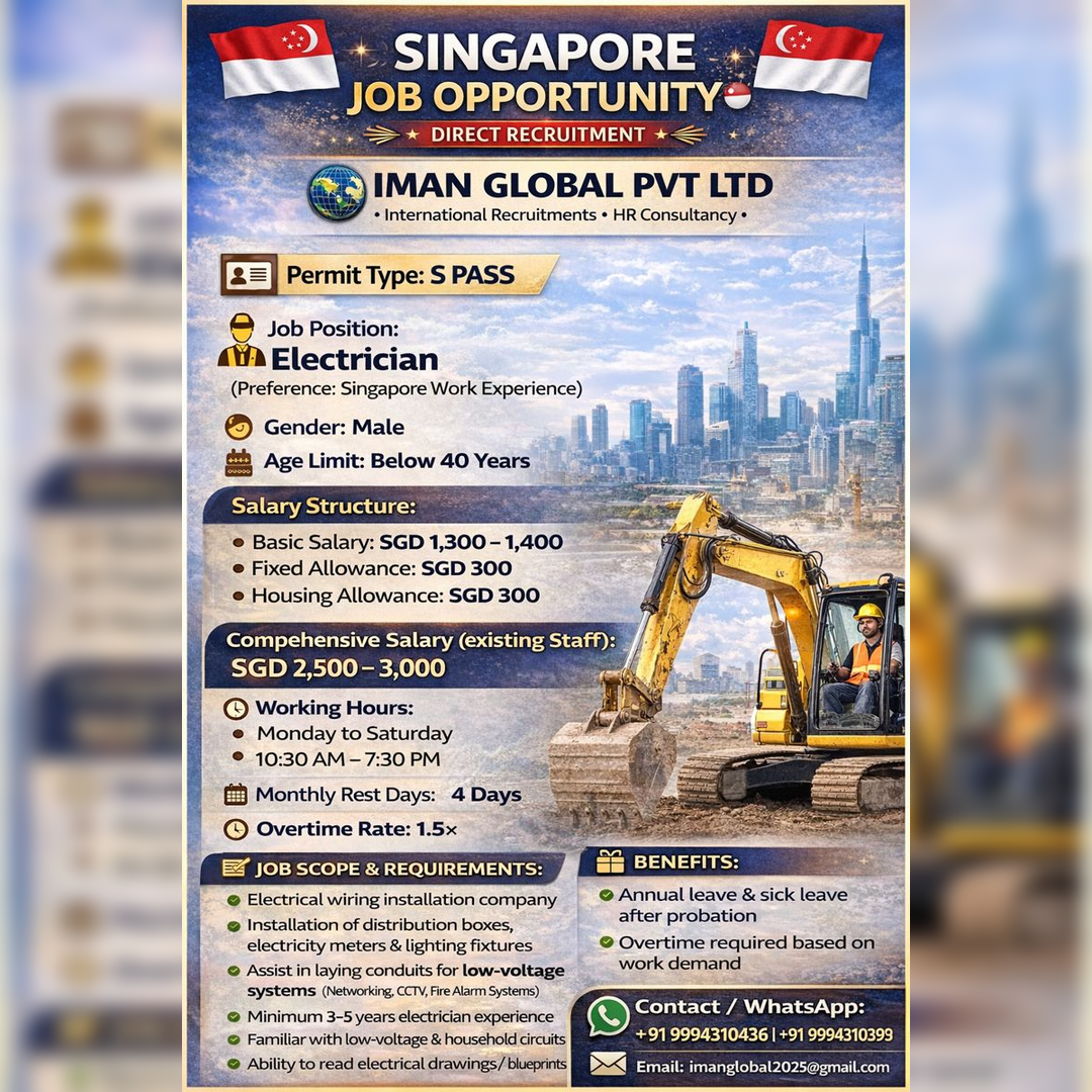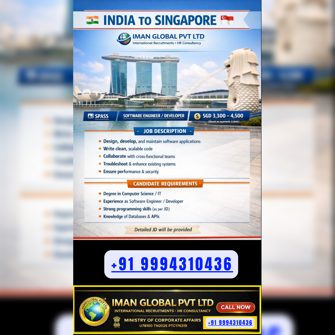 Hiring FOR SINGAPORES PASSOpen Position :DRAFTSMAN/DESIGNER/CURTAIN WALL STRUCTURE DESIGNER (MALE & FEMLAE)SALARY3000 – 5000$ACCOMMODATION & TRANSPORTATION PROVIDEDAGE : BELOW 40 YEARSDUTY : 8 HOURS + O.TQUALIFICATION : B.E / B.TECH…