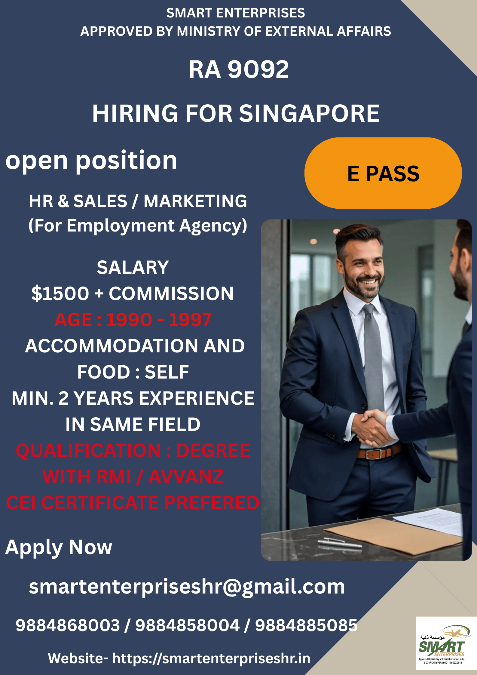 HIRING FOR SINGAPOREE PASSopen positionHR & SALES / MARKETING (For Employment Agency)SALARY$1500 + COMMISSIONAGE : 1990 – 1997ACCOMMODATION AND FOOD : SELFMIN. 2 YEARS EXPERIENCE IN SAME FIELDQUALIFICATION : DEGREE…