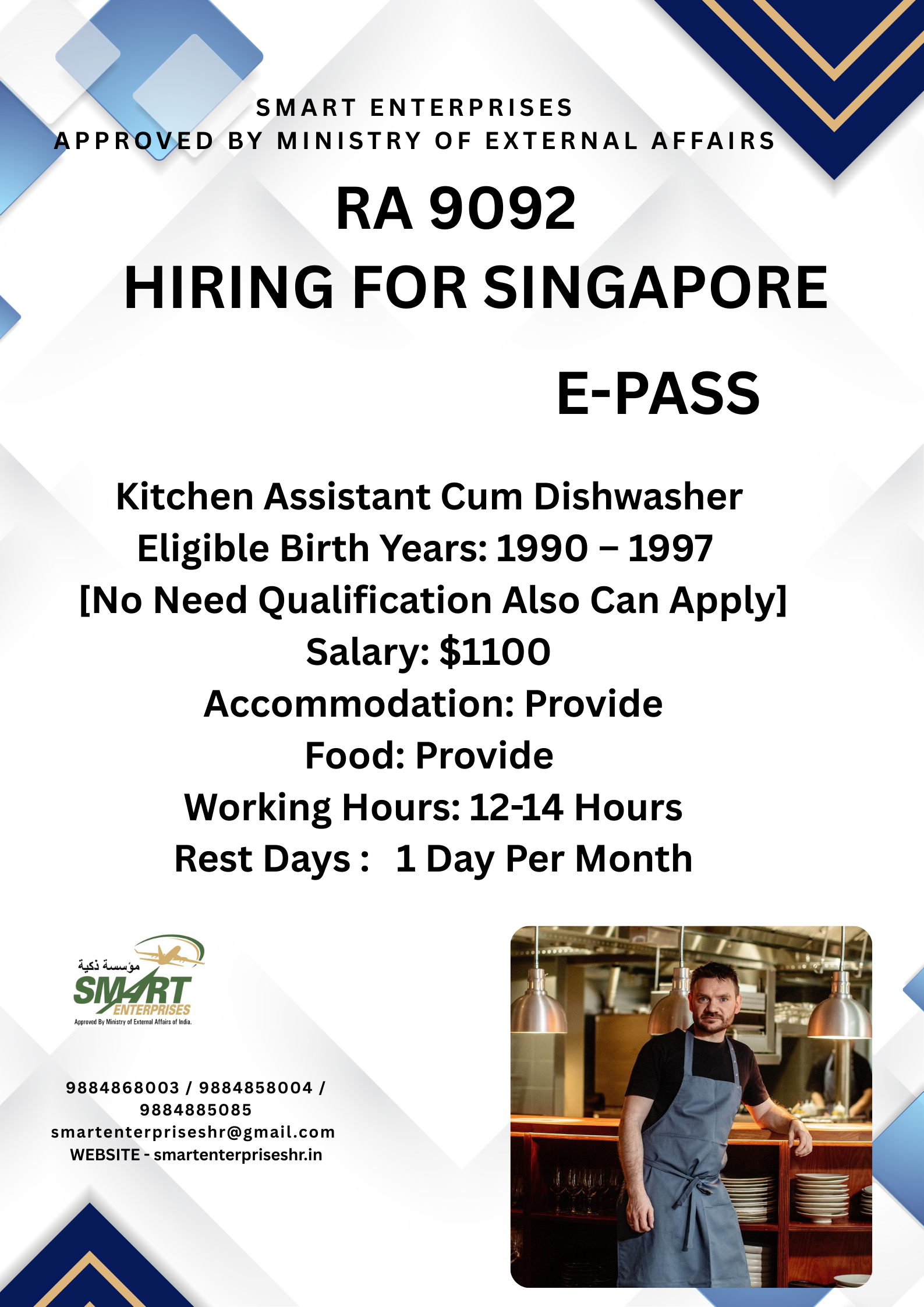 HIRING FOR SINGAPORE RA 9092 E PASS Kitchen Assistant Cum Dishwasher Eligible Birth Years: 1990 – 1997 Salary: $1100 Accommodation: Provide Food: Provide Working Hours: 12-14 Hours Rest Days :…