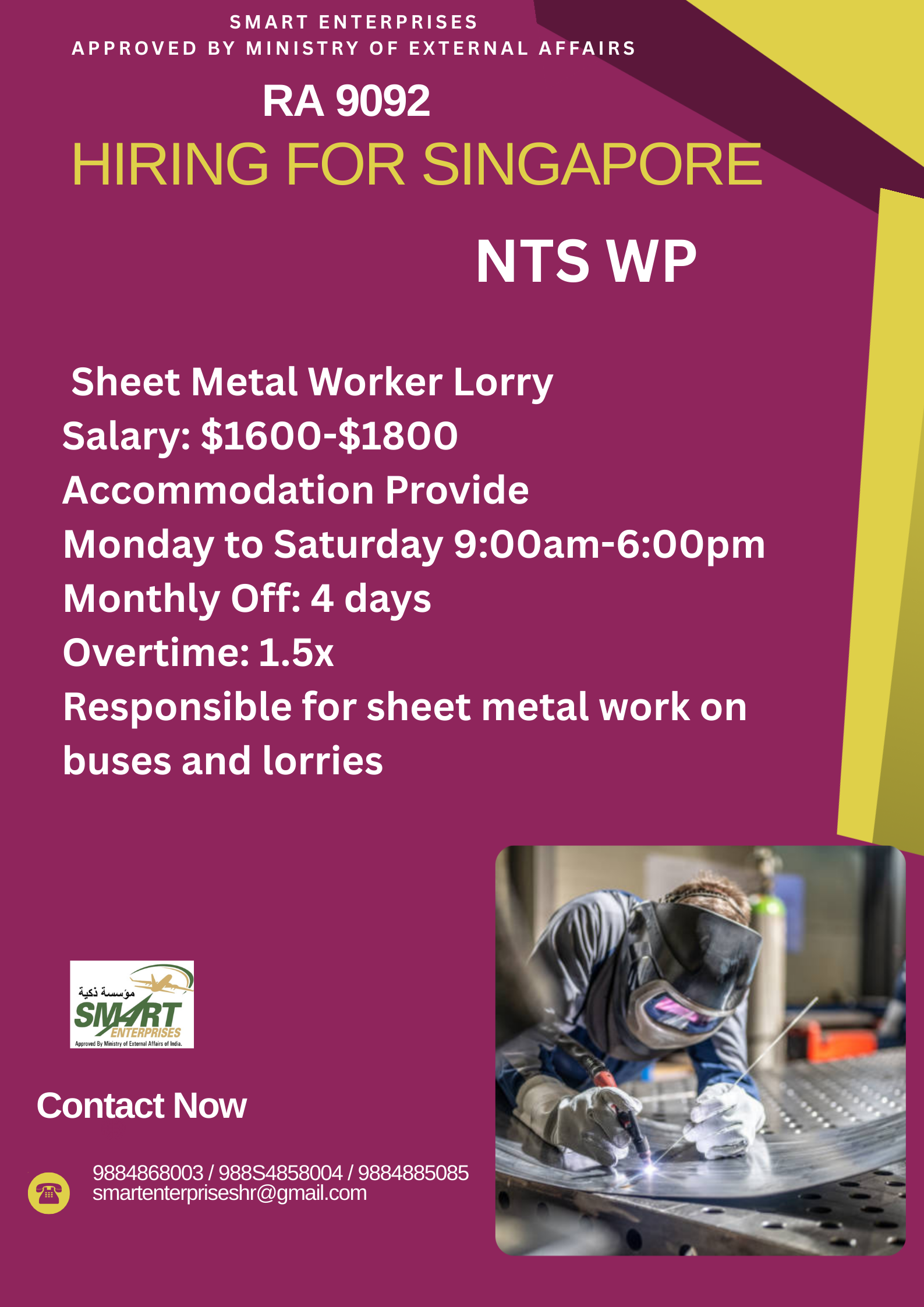 HIRING FOR SINGAPORE RA 9092 NTS WP Sheet Metal Worker Lorry Salary: $1600-$1800 Accommodation Provide Monday to Saturday 9:00am-6:00pm Monthly Off: 4 days Overtime: 1.5x Responsible for sheet metal work…