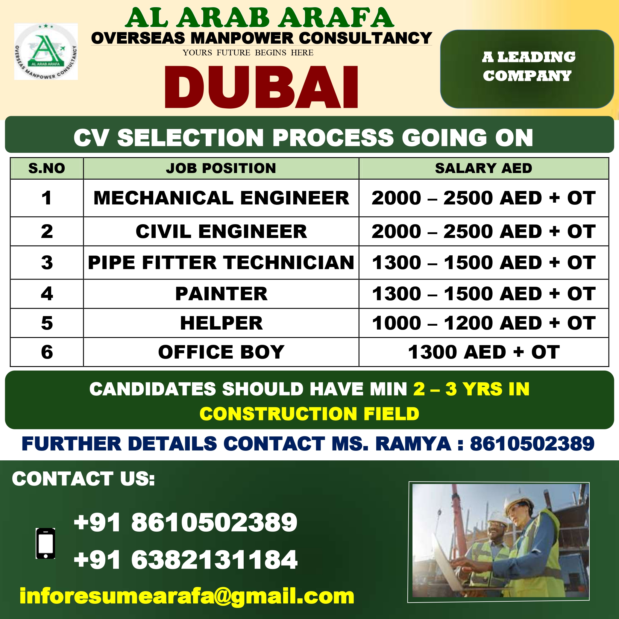 DUBAI – LEADING CONSTRUCTION PROJECT – DIRECT CLIENT INTERVIEW IN CHENNAI @ NOV Last week INDIAN EXPERIENCE ELIGIBLE Min 2 to 4 years any Construction Building Exp must PLS Share…