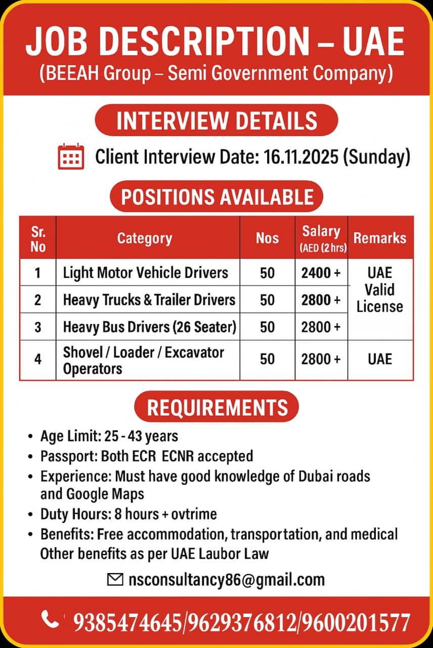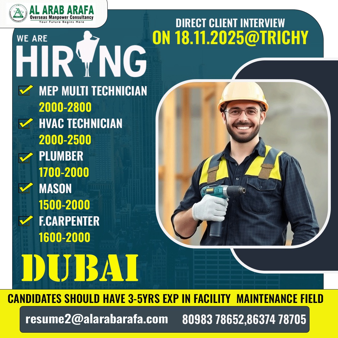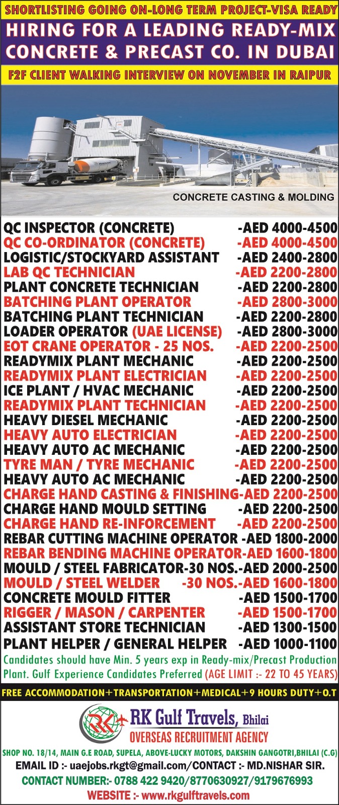 GREETINGS FROM RK GULF TRAVELS, BHILAI. HIRING FOR A LEADING READYMIX & PRECAST CO. – DUBAI (UAE) CLIENT WALKING INTERVIEW ON NOVEMBER-2025 IN RAIPUR. CANDIDATES SHOULD HAVE MINIMUM 4-5 YEARS…