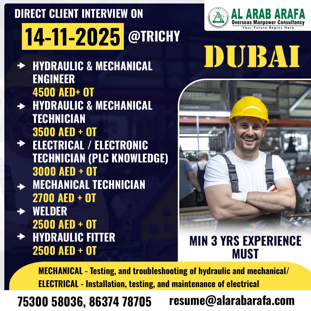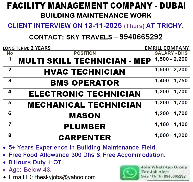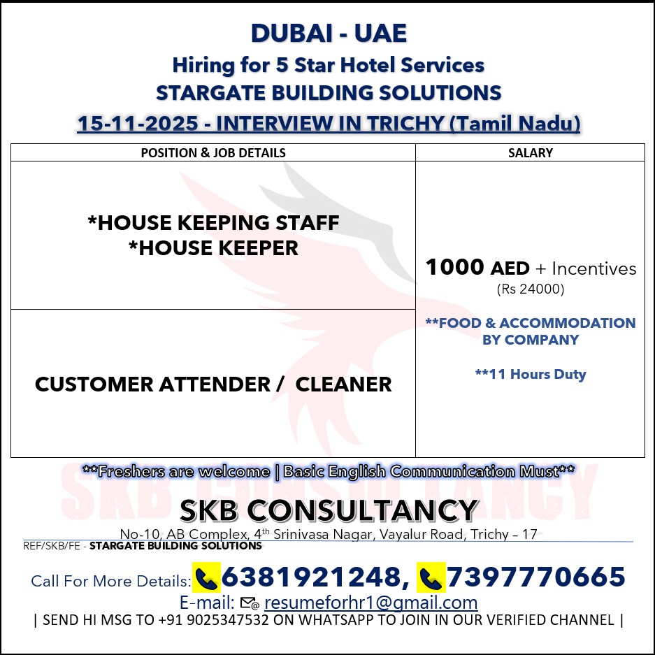 WANTED FOR DUBAI – STARGATE BUILDOMG SERVOCES COMPANY, CLIENT INTERIVEW ON 15-11-2025 AT TRICHY, CALL FOR MORE DETAILS: 6381921248, 7397770665. SKB CONSULTANCY, TRICHY – 17.