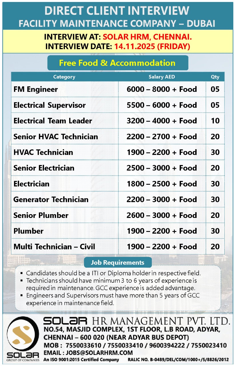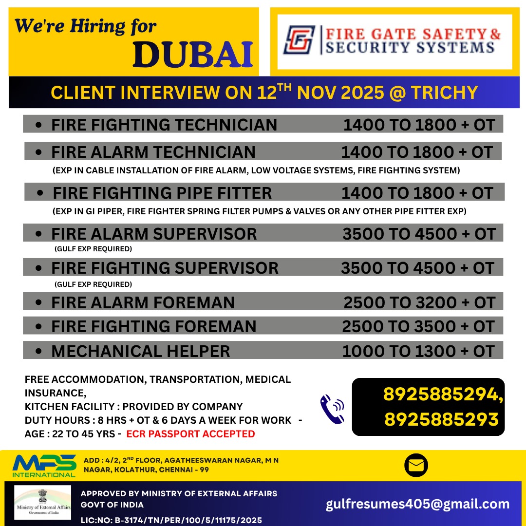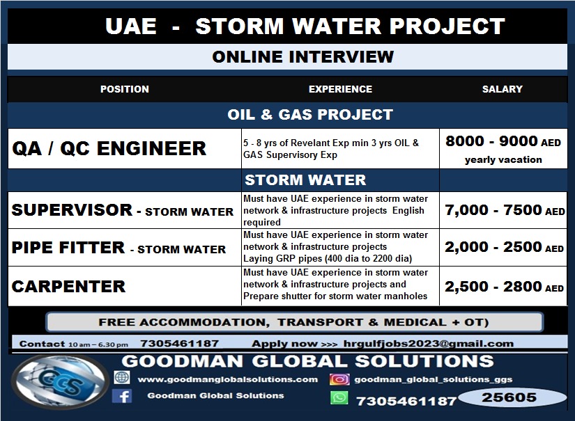 UAE – STORM WATER PROJECT ONLINE INTERVIEW ( CV SHORTLISTING PROCESS IN CHENNAI ) CONTACT – 7305461187 APPLY NOW>>> [email protected] SALARY 2,500 – 7500 AED + OT with FREE ACCOMMODATION,…