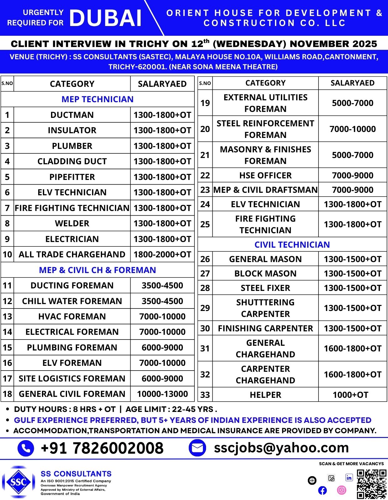 Urgent Hiring for Dubai – Multiple Construction & MEP Vacancies (Foreman, Technician, Mason, Carpenter) Company: ORIENT HOUSE FOR DEVELOPMENT & CONSTRUCTION CO. LLC Recruitment Partner: SS Consultants (An ISO 9001:2015…