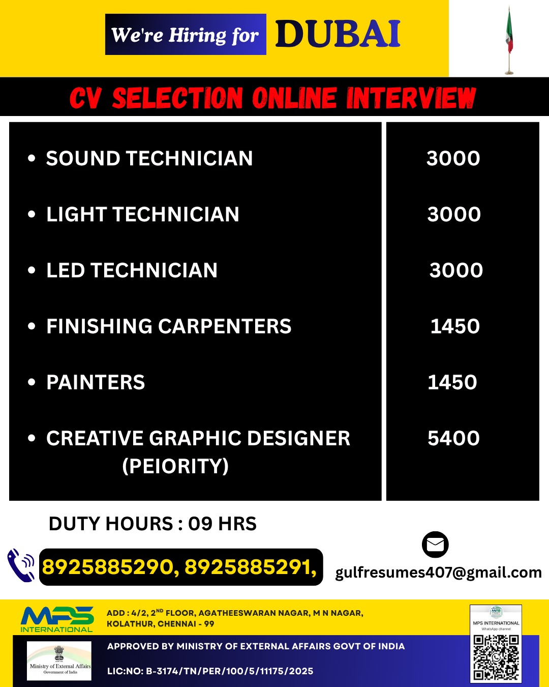 • SOUND TECHNICIAN — 3000• LIGHT TECHNICIAN — 3000• LED TECHNICIAN — 3000• FINISHING CARPENTERS — 1450• PAINTERS — 1450• CREATIVE GRAPHIC DESIGNER (PRIORITY) — 5400 DUTY HOURS : 09…