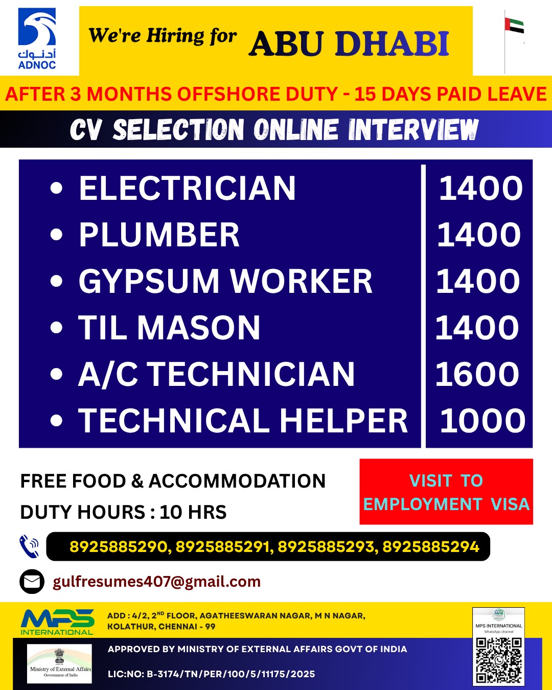 AFTER 3 MONTHS OFFSHORE DUTY – 15 DAYS PAID LEAVE FREE FOOD & ACCOMMODATIONDUTY HOURS : 10 HRS VISIT TO EMPLOYMENT VISA 8925885290, 8925885291, 8925885293, [email protected]