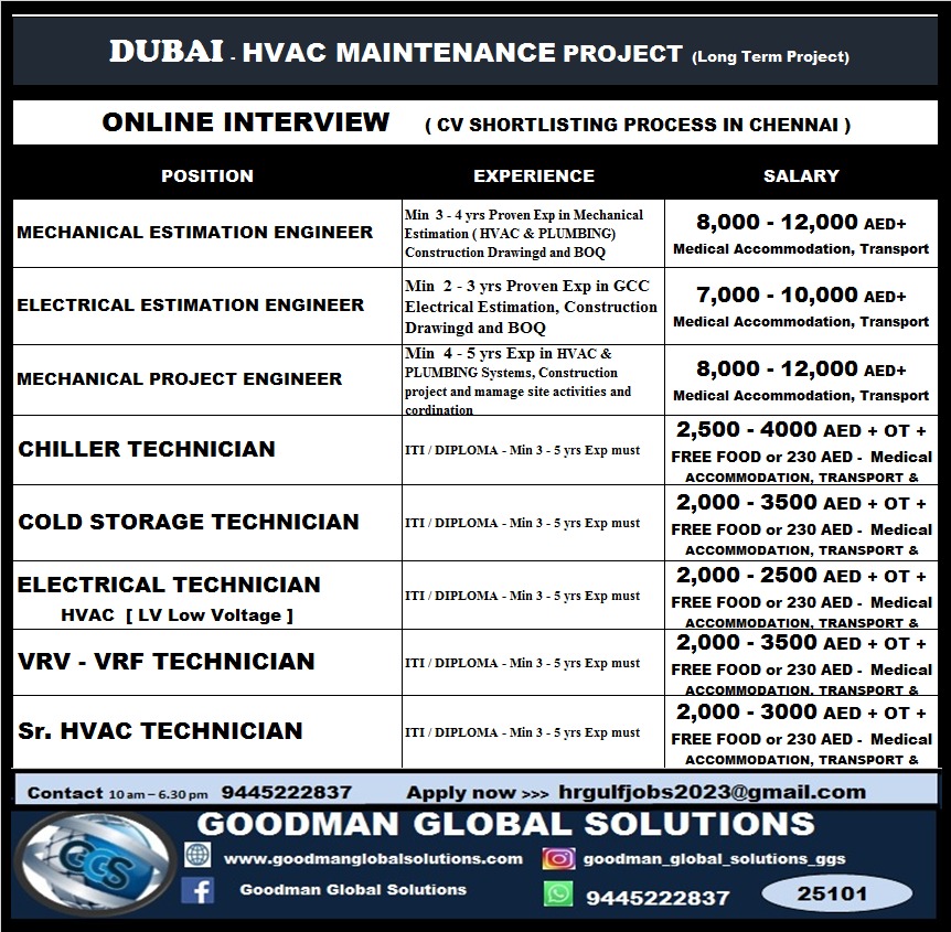 INDUSTRIAL GROUP DUBAI – HVAC Maintenance Project (Long Term Project) ONLINE INTERVIEW – CV Shortlisting under progress CONTACT – 9445222837 APPLY NOW>>> [email protected] 2500 – 4000 AED + OT with…