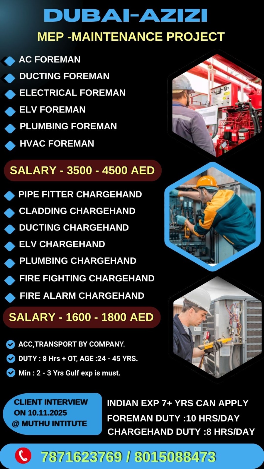 DUBAI – AZIZI 🔸MEP – MAINTENANCE PROJECT 🔺INDIAN EXPERIENCE MIN 7+ OR GULF EXPERIENCE APPLY 🧲DIRECT CLIENT INTERVIEW ON : 10 NOV 2025 @ MUTHU INSTITUTE, MADURAI. INTERVIEW LOCATION 🚗:MUTHU…