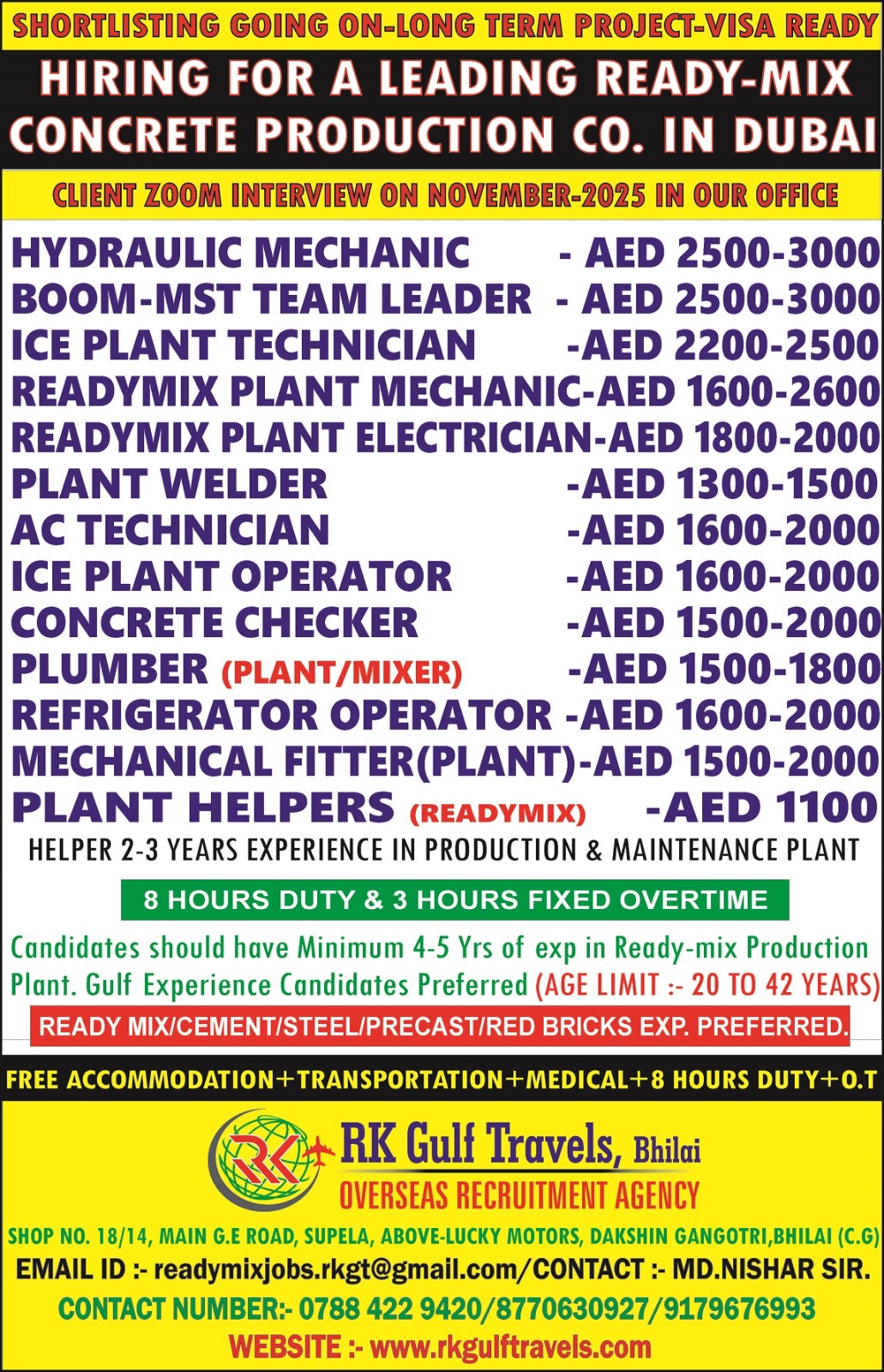 GREETINGS FROM RK GULF TRAVELS, BHILAI. HIRING FOR A LEADING READYMIX & PRECAST CO. – DUBAI (UAE) ZOOM MEETING INTERVIEW ON NOVEMBER-2025 IN RAIPUR. CANDIDATES SHOULD HAVE MINIMUM 4-5 YEARS…