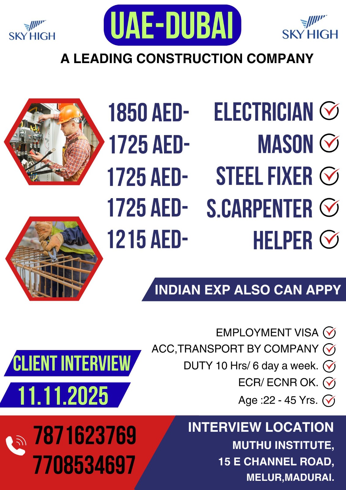 DUBAI – SKY HIGH 🔸A LEADING CONSTRUCTION COMPANY 🔺INDIAN EXP ALSO CAN APPLY 🧲DIRECT CLIENT INTERVIEW ON : 11 NOV 2025 @ MUTHU INSTITUTE, MADURAI. INTERVIEW LOCATION 🚗:MUTHU INSTITUTE15E CHANNEL…
