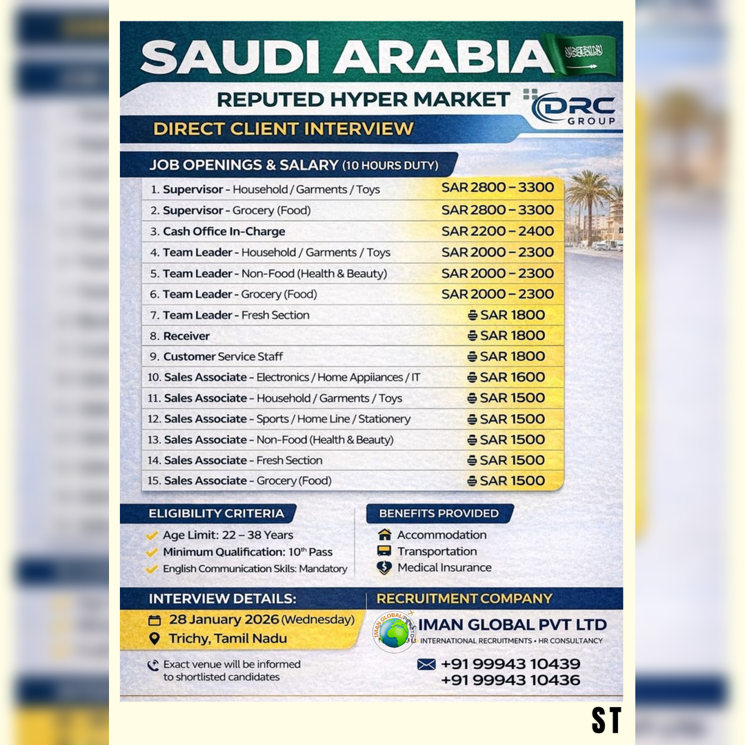 URGENT REQUIREMENT FOR SAUDI ARABIA Interested candidates can share your cv along with all credentials below Mail IdEMAIL:[email protected] NO : 9884650919/044-28256001/28256002/28256003